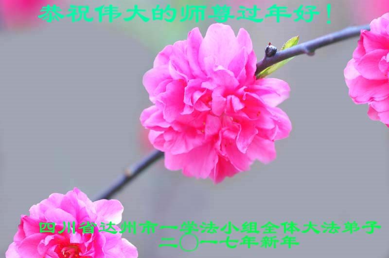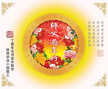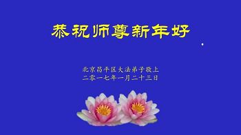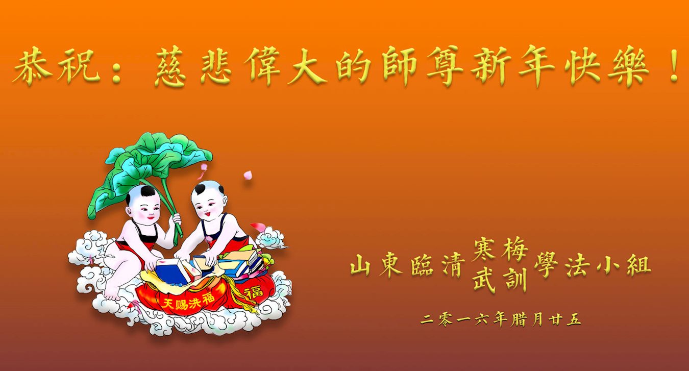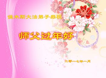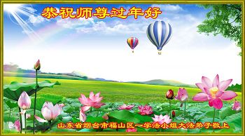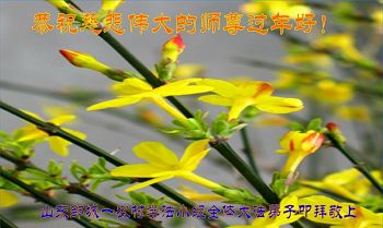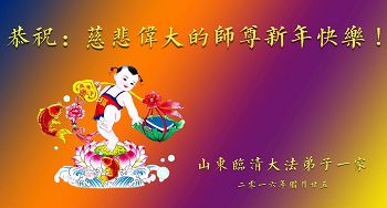 恭祝慈悲伟大的师父新年快乐! 2017,中国的传统新年就要到了,在这辞旧迎新的日子,我们更加想念师父,更觉时间的宝贵,更觉救人的紧迫!我们一定更加珍惜师尊用巨大承受,无量慈悲与付出所延续来的宝贵时间,不辱使命。我们一定用心学法,用心发正念,用心多救人,不负师尊的慈悲苦度! 山东省临清市一学法小组大法弟子敬上 恭祝师尊新年快乐! 师父新年好!弟子跪拜师父! 拿起笔,泪如泉涌!师尊二十多年的传法、正法救众生,得有多大的付出!中共残酷的迫害达十八年之久,师尊为了弟子的得度,为了众生的得救,师父的无量慈悲,巨大承受,又有谁能理解?!作为师尊的弟子,唯一能做的就是紧跟师尊正法路,时时事事用心做好三件事,兑现誓约,回报师尊的救度之恩! 山东省临清市武训学法小组敬上 山东省烟台市福山区大法弟子恭祝师尊过年好!