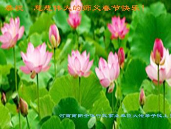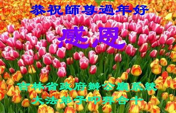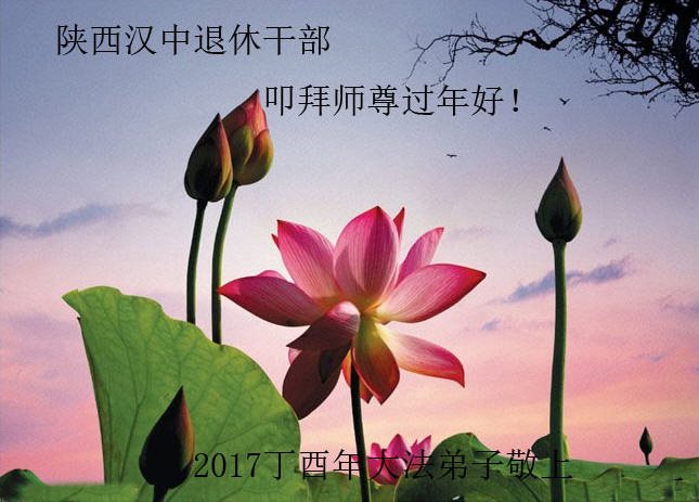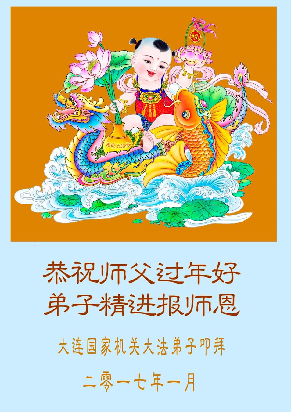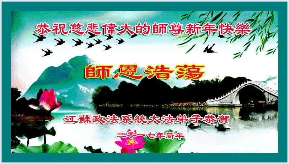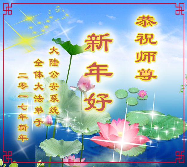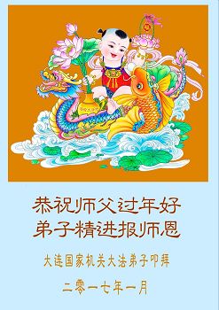 | 【明慧网二零一七年一月二十七日】在中国大陆政府机关、公检法司等机构工作的大法弟子们恭祝师尊新年好! 法轮大法洪大无比,社会各阶层、各行业的人士都能修炼,在政府和公、检、法、司系统工作的人士同样能修炼。特别是在中共江氏集团迫害大法至今的将近十八年中,这些系统被中共当作“专政工具”来参与迫害,越是这样的地方越需要大法弟子讲真相。这些年来,在这些部门工作的大法弟子们也是这样做的。 北京市司法系统的大法弟子表示:十七年助师正法路,多少艰辛多少坎坷。中原大地江鬼当道,豺狼横行,法徒受难,众生呻吟。司法系统成为邪*党-行恶工具、残害人民的帮凶。作为大法弟子,他们曾压力重重,有过彷徨和消沉。但是,有师父大法指引方向,最终放下了人心,丢掉了怕心,站起来,走下去,揭露邪恶,讲真相。 他们说:“我们时时都能感受到师父的精心看护和为弟子的承受。我们所做的一切,不是个人要获得什么,而是洪扬佛法,救度劫难中的众生。” 感恩师父的慈悲救度!恭祝慈悲伟大的师尊过年好!山东省济南市政府机关大法弟子以一首《颂师恩》表达对师尊的感恩和精進实修的决心: 多少泪,师恩语难颂,翘首西望远洋隔,每忆师恩泪泉涌,恩重意难平。 多少愿,修炼无止境,精進路上更加劲,莫负师尊恩情重,精進永不停。 江苏南京公安系统大法弟子恭祝伟大的师尊新年好!辽宁省大连地区国家机关大法弟子叩拜师尊!恭祝师父过年好!感恩师尊!大陆全体法官大法弟子恭祝慈悲伟大的师尊过年好!慈悲伟大的师尊: 大陆全体法官大法弟子恭祝慈悲伟大的师尊过年好!弟子们一定紧跟师尊的正法進程,抓紧学法修心,发正念,讲真相,抓紧救度更多的世人,决不辜负师尊的慈悲苦度。 谢谢慈悲伟大的师尊! 大陆全体法官大法弟子恭祝 山东省济南市政府机关全体老年大法弟子恭祝慈悲伟大的师尊过年好!在新的一年里,我们全体大法弟子紧跟师尊正法步伐,认真做好“三件”大事,决不辜负恩师教导,敬请师尊放心。 颂师恩 多少泪,师恩语难颂,翘首西望远洋隔,每忆师恩泪泉涌,恩重意难平。 多少愿,修炼无止境,精進路上更加劲,莫负师尊恩情重,精進永不停。 山东省济南市政府机关全体老年大法弟子 江苏省司法系统大法弟子恭贺师尊新年快乐!法轮大法佛光普照 众生得救穹宇昌耀 陕西汉中机关退休干部恭贺师尊丁酉年新年好!北京市司法系统一学法小组全体大法弟子恭祝伟大的师尊新年好!金鸡一唱天欲晓, 佛法广传正气高。 恶首末日临法办, 世人齐颂大法好。 十七年助师正法路,多少艰辛多少坎坷。中原大地江鬼当道,豺狼横行,法徒受难,众生呻吟。司法系统成为邪*党-行恶工具、残害人民的帮凶。作为司法系统中的大法弟子,心里更加沉痛。 我们也受过迫害,骚扰,压力重重,有过彷徨,有过消沉。但是,有师父佛法指引方向,我们放下了人心,丢掉了怕心,站起来,走下去,揭露邪恶,讲真相,证实大法,救度众生。 诉江案,全组参与实名控告。我们时时都能感受到师父的精心看护和为弟子的承受。我们所做的一切,不是个人要获得什么,而是洪扬佛法,救度劫难中的众生。我们走的路最正,做的事最正!我们是正法时期的大法弟子,信师信法,永沐佛恩。 天象大变,行恶者纷纷遭报,“停止迫害”,“审判江泽民”,法轮功已成为世界共同声音。 邪恶还未除尽,迫害还在发生。我们一定遵循师父的教导,做好三件事,不惰不松,做到修炼如初,越到最后越精進!再一次合十问候师父好! 北京市司法系统一学法小组全体大法弟子敬上。 山东省济南市机关多名大法弟子恭祝慈悲伟大的师父新年快乐!吉林省政府办公厅系统全体大法弟子恭祝师尊过年好!大陆锦州一公务员大法弟子恭祝师父新年快乐!江苏政法系统大法弟子向师尊拜年!恭祝师尊新年快乐!师尊,您为众生辛苦了!谢谢您对弟子的看护与付出!我们一定更加努力做好三件事,用实际行动回报师尊! 辽宁一法官大法弟子恭祝师父新年快乐!大陆辽宁政法系统一大法弟子恭祝师父新春快乐!河南省南阳市卧龙区检察院一家三代大法弟子恭祝师父新年快乐!湖北省武汉市某行政执法单位大法弟子恭祝师尊过年好!“每逢佳节倍思亲”,再过几天,中国人就要辞旧岁迎新年了,作为弟子,我们非常想念慈悲伟大的师尊,在此叩拜师尊,恭祝师尊过年好! 湖北省武汉市某行政执法单位大法弟子恭祝 二零一七年一月二十日 在天津市政府工作的大法弟子恭祝师尊新年好!弟子常常感受到师父对弟子的护佑,但想到自己还有好多执着心,又觉的愧对师父。 新的一年,弟子一定努力做好三件事,带好大法小弟子,早日跟师父回家。 山东济南章丘区政法系统一大法弟子恭祝慈悲伟大的师尊过年好!感谢师父多年来的关心和看护,感恩师父的慈悲教诲,用尽世间的语言也无法表达对师父的感恩。千言万语汇成一句话:师父过年好!弟子给师父拜年了! 济南章丘区政法系统一大法弟子跪拜师父 天津市政府机关大法弟子恭祝师父过年好!天津市政府机关大法弟子叩拜 敬上 大陆公安系统大法弟子恭祝慈悲伟大的师尊过年好!辽宁公安系统大法弟子恭祝慈悲伟大的师尊过年好!大陆司法系统大法弟子恭祝慈悲伟大的师尊新年快乐!弟子一定精進实修,做好三件事,救度更多的世人和生命,不负师尊的慈悲苦度。 大陆司法系统大法弟子敬祝 青岛政府