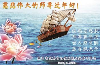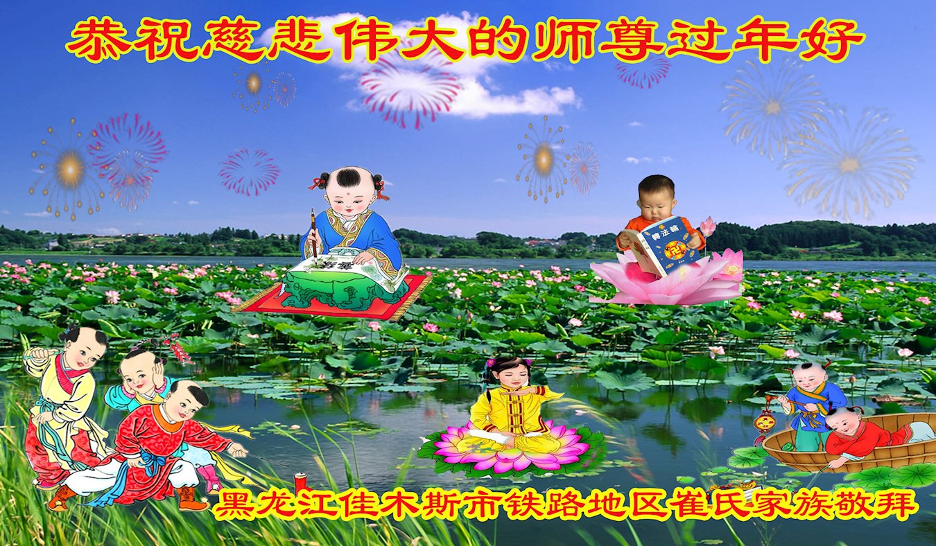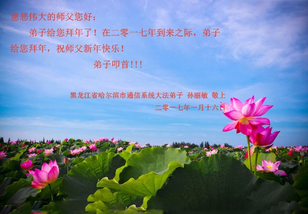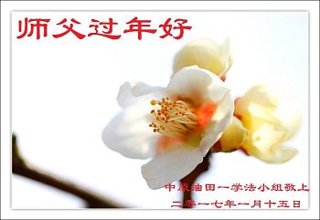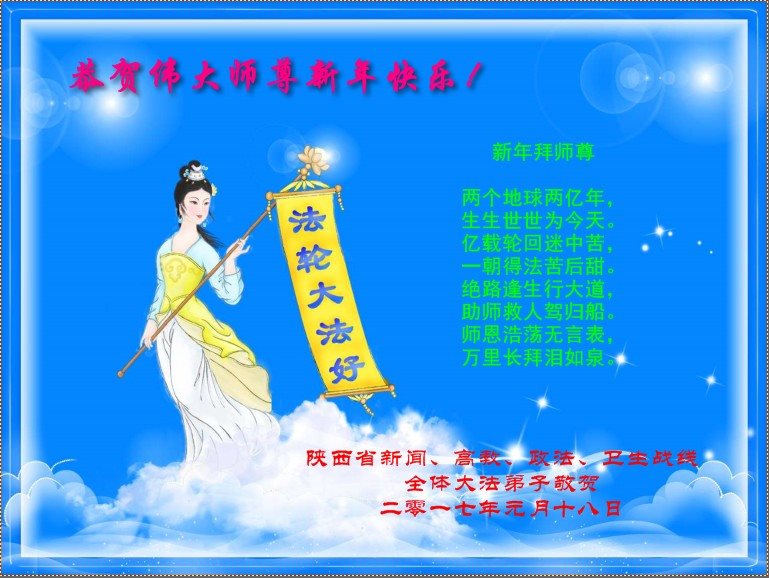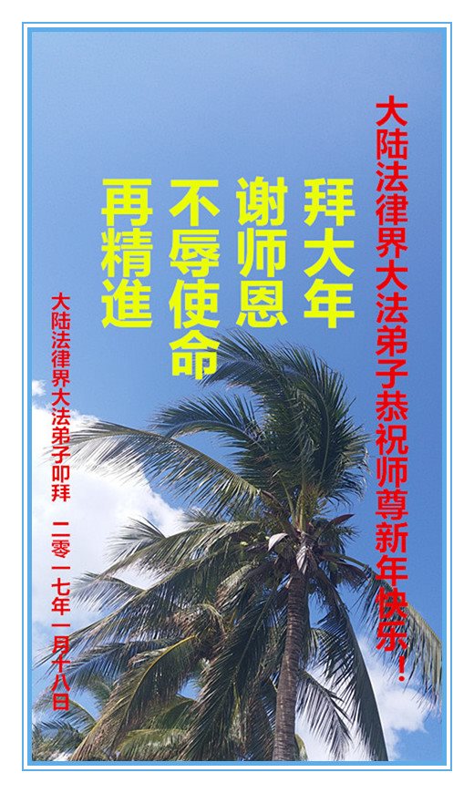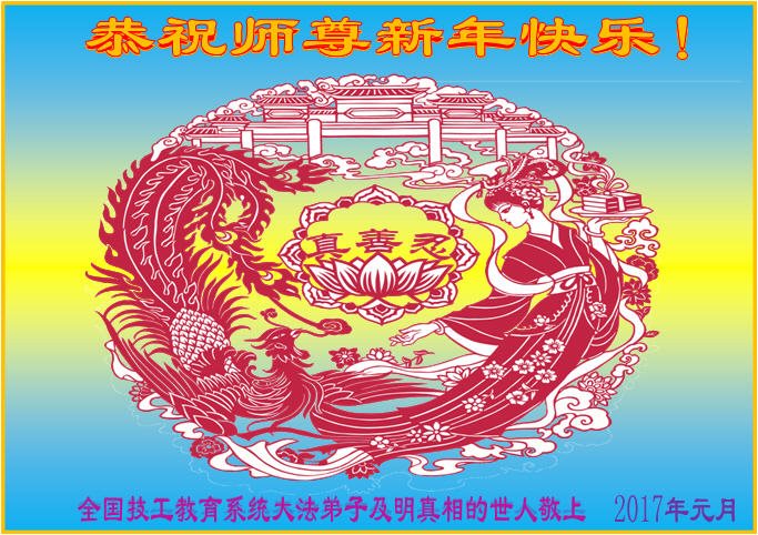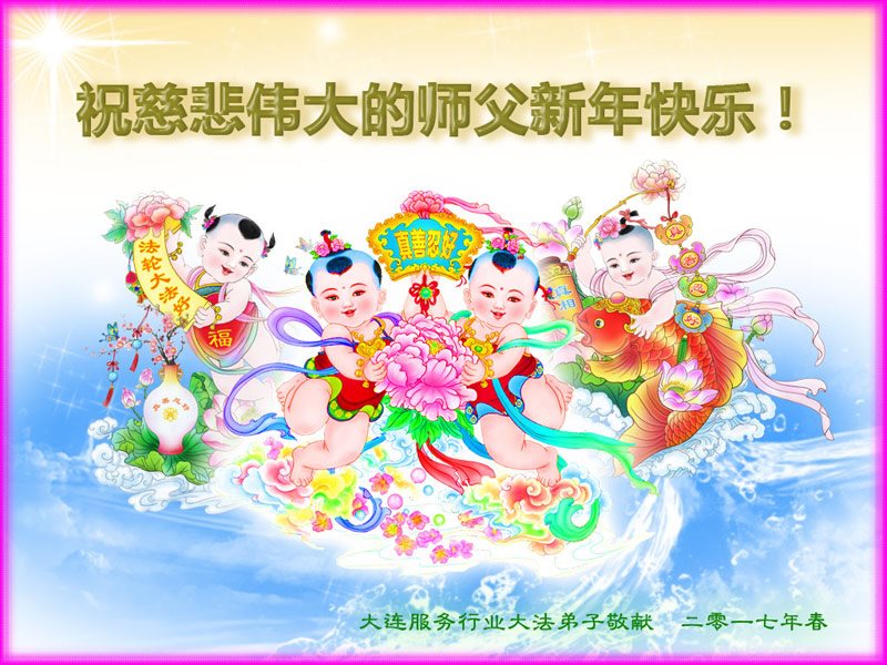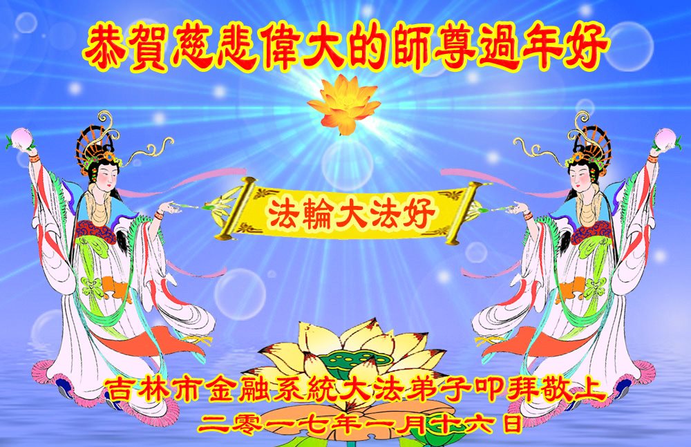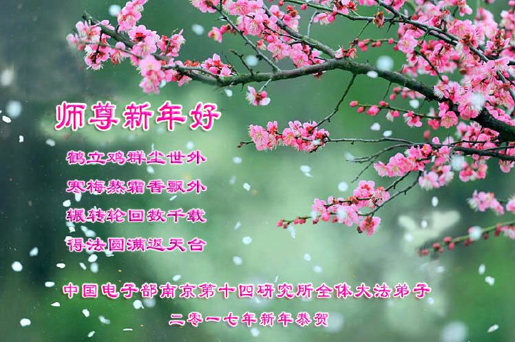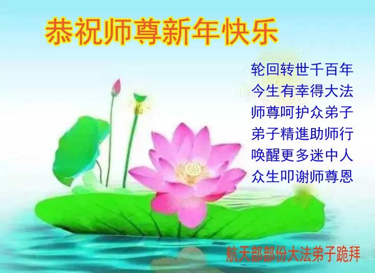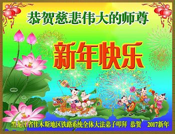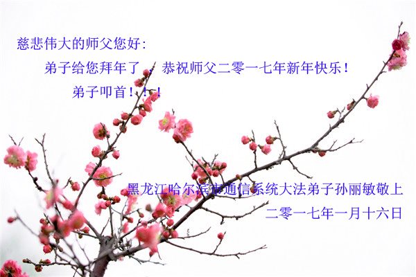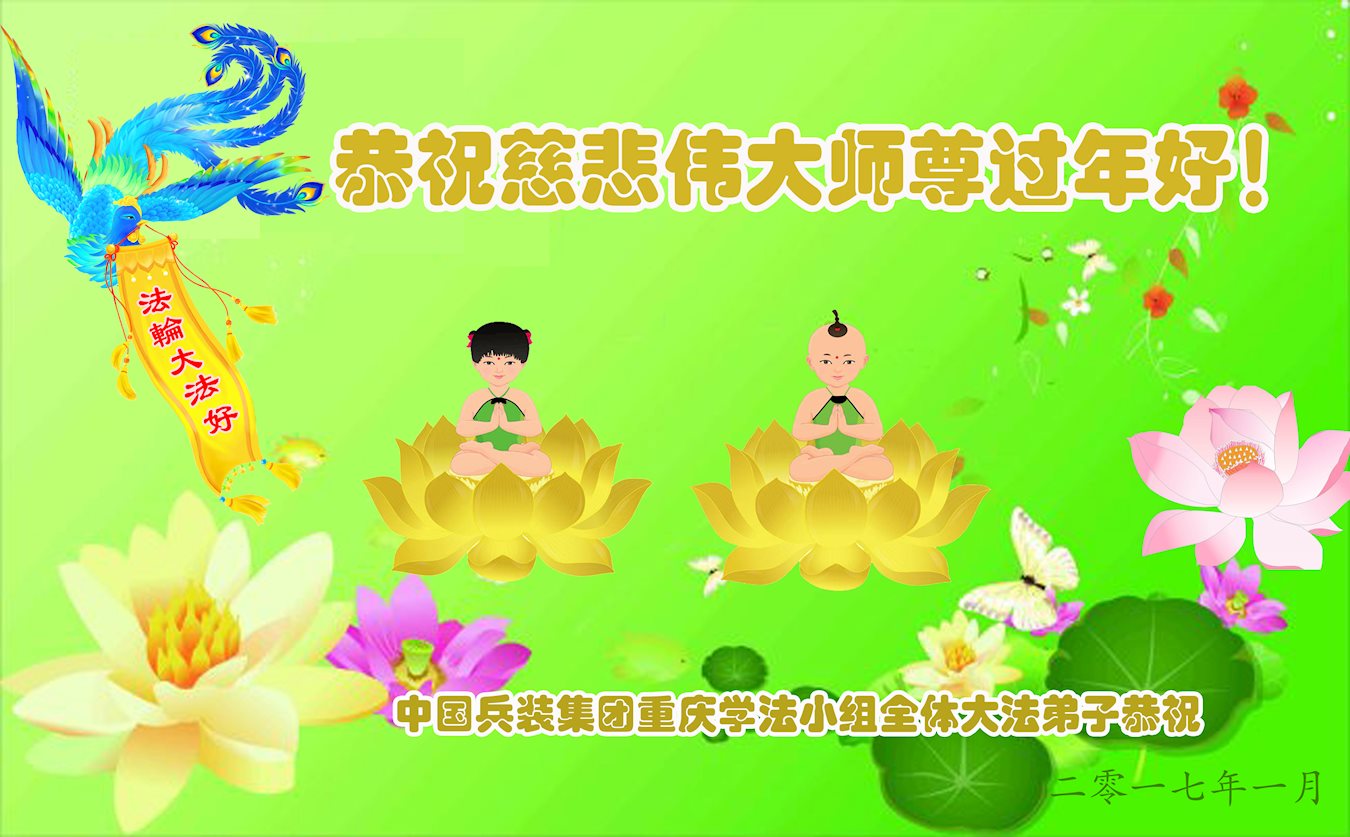 | 【明慧网二零一七年一月二十七日】2017年中国传统新年来临,工作和学习在40多个行业的大法弟子给尊敬的李洪志师尊发来贺词,感恩师尊的慈悲呵护和救度。 明慧网收到来自航天、兵工、检察、教育、金融、医药卫生、电信、通信、卫生、石油、气象、交通、新闻、政法、农垦、畜牧业、林业、矿业、铁路、电力、环卫、供销社、税务、水利、政府机关、法律界、商业界、音乐界、艺术界,还有银行业、保险业、公共交通业、出租车行业、建筑业、美容、家政、服务行业、出版发行、维修、运输、个体经营、会计、军队等,40多个行业和部门的大法弟子的贺词,感恩之情,溢于言表。法轮大法由李洪志师尊传世二十五年,修炼者近亿人,虽经中共江氏集团打压迫害十七年,大法弟子们在艰辛的环境中,在大法的引领下,越来越修炼的成熟、坚定、纯净。 大陆注册会计师、评估师行业大法弟子说:“师父您为了挽救苍宇众生于坏灭之际,您辛苦了!弟子们非常想念您!弟子们在师父慈悲的呵护中走过了看似崎岖却有惊无险的一年。弟子们一定利用各种环境讲清真相,精進实修。” 北京顺义、怀柔大法弟子说:“我们来自不同的职业,我们有着不同的年龄,我们有着共同的信仰,我们恪守共同的信念──坚修法轮大法到底,跟师尊回家,不论前面还有多远的路程。” 全国技工教育系统大法弟子及明真相的世人恭祝师尊新年快乐!谢谢师尊慈悲苦度!弟子唯有精進再精進,修好自己、跟上正法進程,去掉求安逸、麻木、怠慢之心,抓紧时间、兑现誓约多救人。 大陆法律界大法弟子恭祝师尊丁酉年新年快乐!拜大年 谢师尊 不辱使命 再精進 大陆法律界大法弟子跪拜 航天部部份大法弟子:“以法为师平稳的做着三件事”在即将到来的丁酉年之际,我们恭祝伟大慈悲的师尊新年好! 在中共恶党这十七年的迫害中,我地区的大法弟子在师尊的呵护下,正念正行的做着三件事,助师正法。无论邪恶怎么迫害,我们多以法为师平稳的做着三件事。在新的一年里,我们要更多的救人,让师尊少操心。我们千言万语无法表达对师尊感恩之心。 恭祝师尊新年好! 弟子叩拜师尊! 航天部部份大法弟子跪拜 安徽安庆检察系统大法弟子:“千言万语化精進,救度众生随师还”安徽安庆检察系统大法弟子恭祝师父新年好! 安庆检察系统大法弟子恭祝师父:新年快乐! 千言万语化精進,救度众生随师还。 唐山教育系统大法弟子:“弟子也替得救的教师与学生们谢谢师父!”唐山教育系统大法弟子恭祝师父新春快乐! 作为教育系统的大法弟子,在大陆现代科学充斥各个领域、无神论、進化论和对大法欺世谎言的毒害、对大法弟子残酷的迫害的环境中,深知师父救度众生的艰难,弟子肩负助师正法的重担。感恩师父! 回首过去的一年,师父为了不落下一个弟子,救度更多的迷中众生,用怎样的承受拖延着时间,化解了宇宙中一个又一个旧势力已定好的劫难。作为弟子深深知道,要不是师父传宇宙大法,就没有我们和世人的今天。 弟子们的点滴進步都浸透着师父的慈悲与辛苦,作为大陆教育系统的弟子,虽看不到师父,但师父的话儿在心里牢牢记住。我们时时能感受到师父的慈悲看护,在修炼的路上,跌倒了是师父把我们扶,慈祥的指出我们的不足;微笑的鼓励着我们走好以后的路。作为弟子,我们紧随师父,我们要学师父对众生的态度,把世人都当作亲人,甘愿付,出多多救度!弟子也替得救的教师与学生们谢谢师父!再一次问候师父:师父过年好!谢谢师父把我们救度! 中国兵装集团重庆一学法小组全体大法弟子恭祝师尊新年好!学法小组全体大法弟子给师尊拜年了,恭祝师尊新年快乐!我们要抓紧时间努力做好师父要求的三件事,让师父少一份操劳、多一份欣慰。 河北华北油田大法弟子:“忍苦不懈,多救人”河北华北油田大法弟子恭祝师父新春快乐! 在新年来临之际,弟子们一定以法为师,精進实修,形成金刚不破之整体,忍苦不懈,多救人,兑现誓约,不负使命。 工业和信息化部南京第十四研究所全体大法弟子:“辗转轮回数千载 得法圆满返天台”中国工业和信息化部南京第十四研究所全体大法弟子恭贺师尊新年好! 鹤立鸡群尘世外 寒梅熬霜香飘外 辗转轮回数千载 得法圆满返天台 黑龙江省教育系统全体大法弟子恭祝慈悲伟大的师尊新年快乐!茫茫红尘迷失本性 苦海轮回一梦不醒 浑浑噩噩中我们猛然惊醒 是慈悲伟大的师尊将法轮大法的真善忍 植入了我们黑暗的心灵 唤醒了我们迷失的本性 使我们又重新见到了人生道路上的光明前景 告别了那红尘险恶的狰狞 走向了那无限光明的纯净 找到了我们迷失已久的本性 对人生又充满了美好憧憬 我们发现 我们曾经在人生的道路上为了自己的功名 在我们的心灵上不知不觉的蒙上了多少阴影 我们发现 我们曾经在追求情欲中为了自己的得失 在不知不觉中又迷失了多少本性 然而今天我们才如梦方醒 是慈悲伟大的师尊洪传的法轮大法洗净了我们污浊不堪的心灵 告别了那争争斗斗的险境 走出了那勾心斗角的陷阱 在修炼法轮大法中 我们一步一步的找回了迷失的本性 在救度众生中 我们一步一步走向了那无私无我的美好仙境 新年之际感恩之心化飞鸿 我们隔洋叩拜——师尊新年快乐! 山西大同兵工系统大法弟子全家恭祝慈悲伟大的师尊过年好!恭祝慈悲伟大的师尊过年好