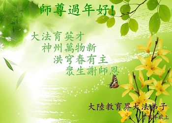 尊敬的师尊好: 在中国传统节日新年即将来临之际,请让我们发自内心的说一声:师尊过年好!师尊辛苦啦!在师尊的慈悲看护下,我们学法小组在风雨中平稳的走过了十几年。请师尊放心,在未来有限的时间里,我们一定抓紧做好三件事,努力修好自己,助师正法救度更多的众生,早日跟师尊回家! 吉林大学一学法小组全体大法弟子 大陆教育界大法弟子恭祝师尊过年好!