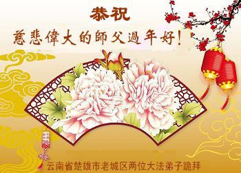 感恩师尊的慈悲救度!愿师尊多一份欣慰,少一份操劳!师父,您辛苦了!在新的一年里,我们一定用心做好三件事,珍惜师父您用巨大的付出给我们延续下来的时间,不辱使命随师回家! 云南省楚雄州楚雄市老城区两位大法弟子给师尊拜年:恭祝尊敬的慈悲伟大的师父过年好!