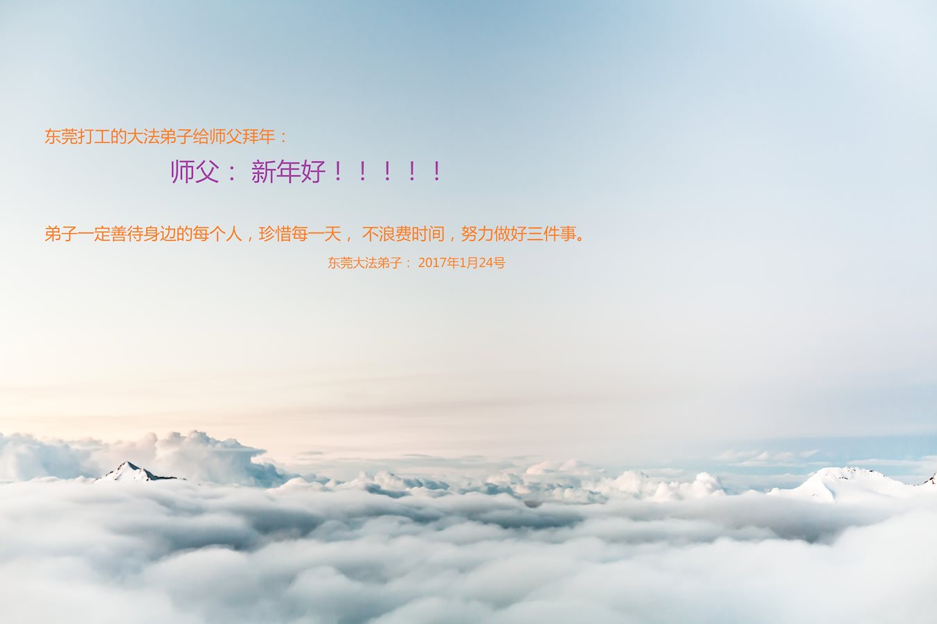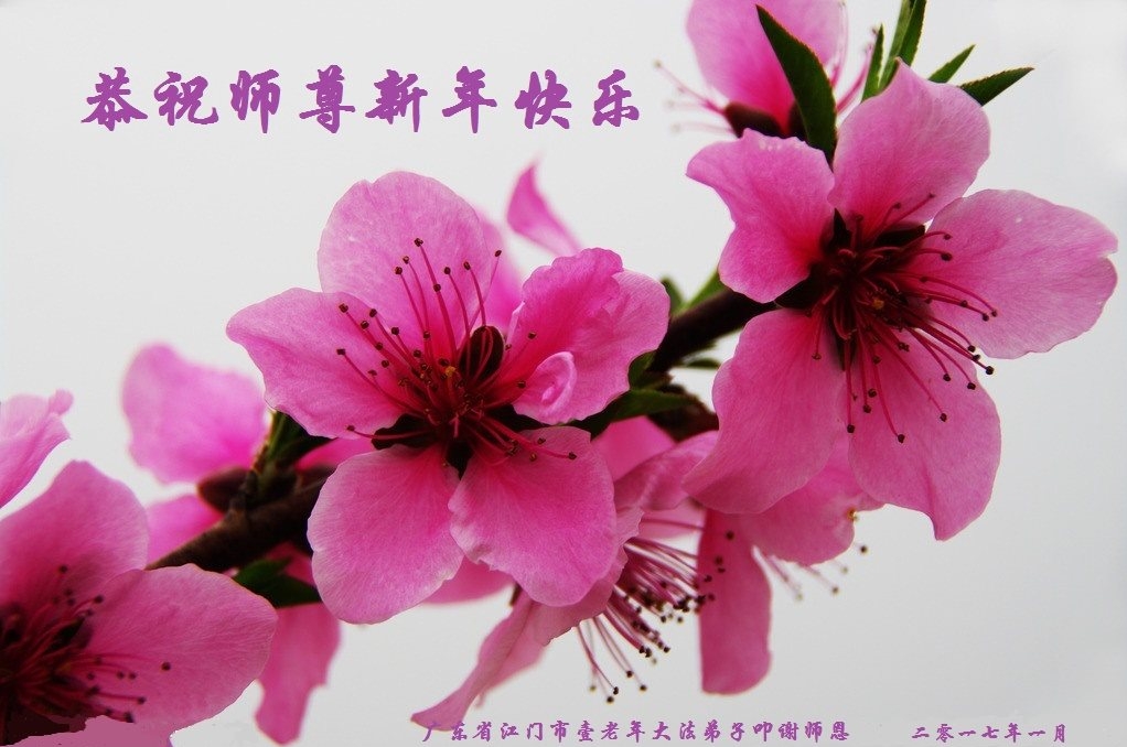 慈悲伟大的师尊新年好!在新的一年里要勇猛精進,学法修心,努力做好三件事,跟师父回家。 叩拜师尊! 大陆大法弟子 二零一七年元月二十五 广东省江门市大法弟子恭祝师尊新年快乐!