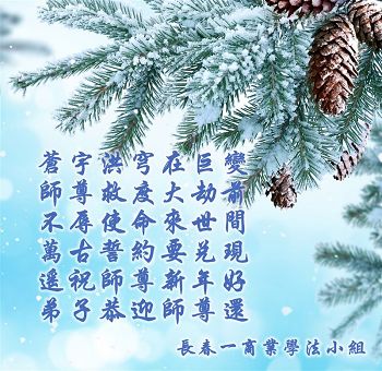 新春佳节就要到了! 在这辞旧迎新的时刻,我们远隔重洋,敬祝师父新年快乐!我们非常想念慈悲伟大的师父!祈盼师父早返中原!我们一定多学法、学好法,努力多救人,回报师父的慈悲苦度! 我们学法组全体同修共同敬上! 山东省烟台市招远市一学法组 河北省保定一大法弟子学法小组恭祝师尊新年快乐!
