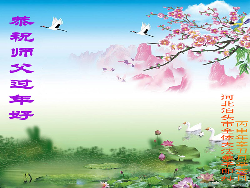 师父您好:在新的一年里,我们要更加精進、实修。做好三件事,多救人,完成大法弟子的使命,跟上正法進程,完成自己的史前大愿,不辜负师父的慈悲苦度! 中国大陆某地区反迫害小组大法弟子向师尊拜年!尊敬的师尊过年好!
