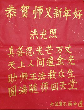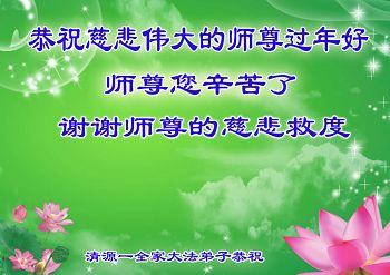 师尊辛苦了,大陆大法弟子想念您!我们都修炼了十八、九年,虽然磕磕绊绊,但谁也改变不了我们坚修到底、跟师尊回家的信念,听师尊的话,在实修中践行自己的诺言,救人中修掉自己后天形成的观念,不管酷暑严寒,讲真相谁也不能阻拦,有缘人纷纷退!党!,为自己选择美好的明天,这是我们最大的心愿,愿天下人都得真相得救度,善待大法一念,天赐幸福平安。 山东省青岛市城阳区大法弟子给师父拜年:恭祝师父过年好!