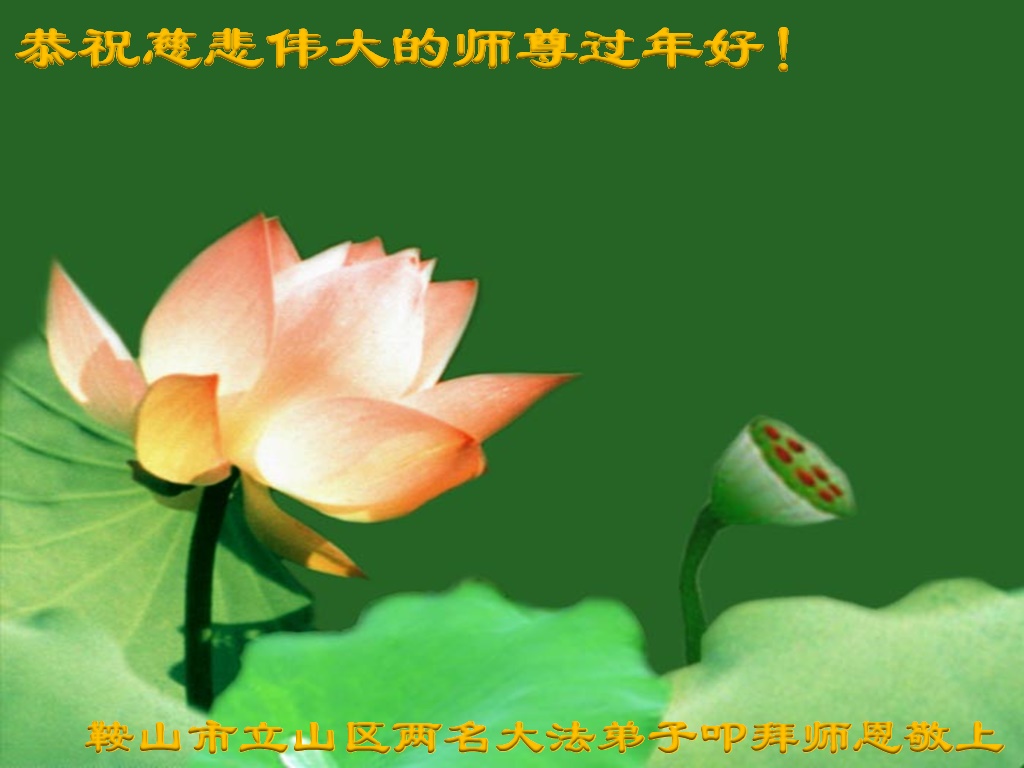 在新的一年里,弟子们勇猛精進,不辜负师尊慈悲救度。弟子们多救人,圆满随师还。 辽宁省鞍山市立山区两名大法弟子恭祝慈悲伟大的师尊过年好!