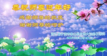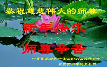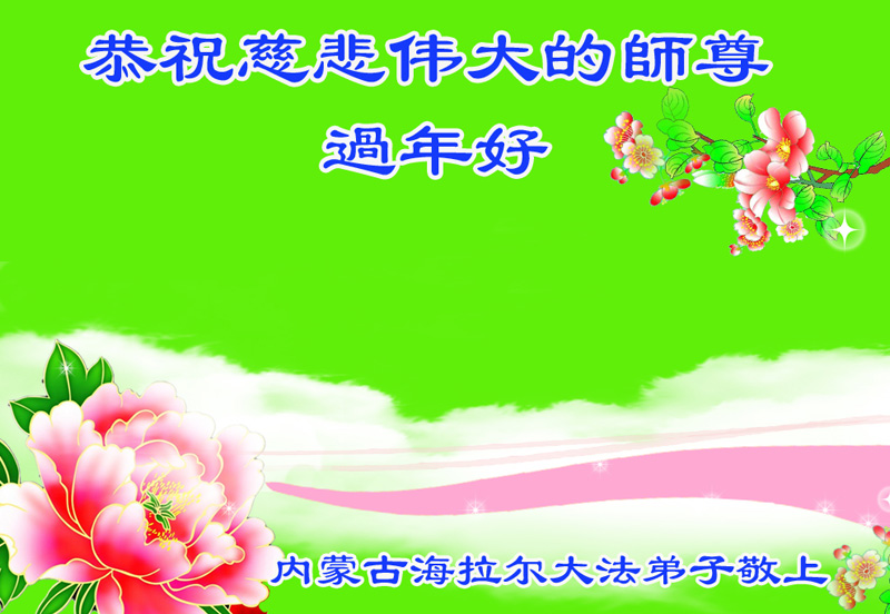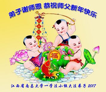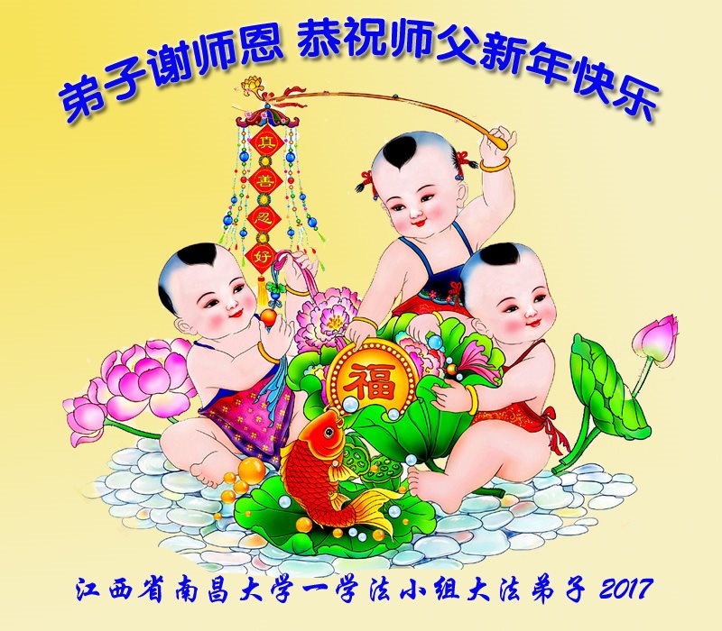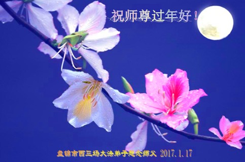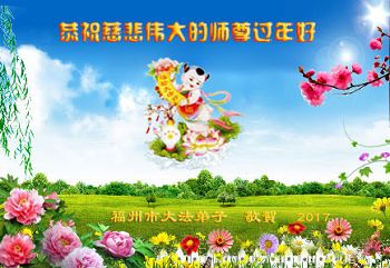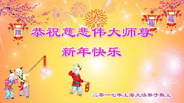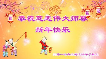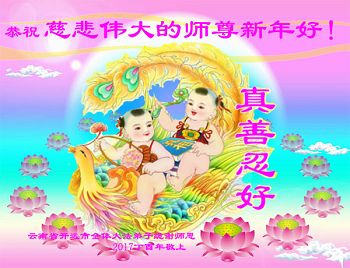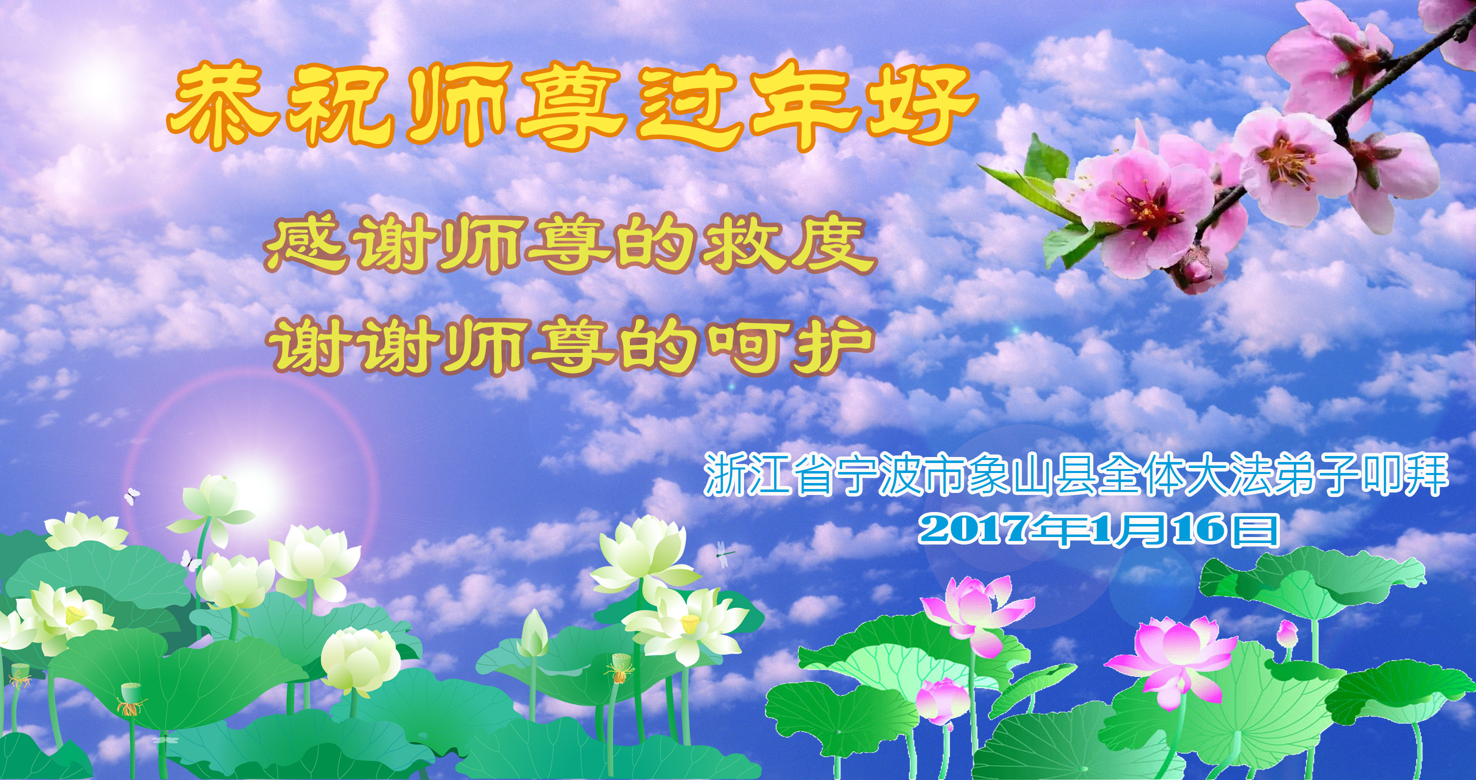 | 【明慧网二零一七年一月二十八日】从南疆到北国,从东海岸到西域边城,中国大陆各地大法弟子共同祝愿慈悲伟大的李洪志师尊新年好! 以下为来自中国大陆冀、晋、辽、吉、黑、苏、浙、皖、闽、赣、鲁、豫、鄂、湘、粤、川、贵、云、陕、甘、京、津、沪、渝、宁、新、藏、桂、蒙、青30个省、自治区、直辖市的大法弟子敬献师尊的新年贺词。 共祝师尊新年快乐!在南国温润的冬日里, 鲜花盛开,绿水长流。 沐浴在春天般的骄阳下 令人联想大法那 普度的佛光; 令人感受那得度的欢畅。 在北国冰雪玉洁的天地里, 万籁俱寂,天地白茫茫。 沉浸在童话般的世界里 使人心清气爽 体悟那纯洁、神圣的法理 令人感念那威武不屈, 坚如磐石的豪放。 是法轮大法的威德, 开创了中华大地繁荣的天地 丰富的文化; 是师尊的大慈大悲 净化了天地众生 使中华大地重获新生。 在中国新年 万象更新的日子里 贺年卡,拜年信 象雪片般 从南疆到北国, 从东海岸到西域边城 共飞向明慧网, 飞向我们至亲至敬的师尊身旁。 两岸三地的大法弟子 共祝愿 我们慈悲伟大的师尊 新年快乐! 再次恭祝慈悲伟大的师尊中国新年快乐! 江苏连云港四位大法弟子叩拜 内蒙古海拉尔大法弟子恭祝师父过年好!浙江省宁波市象山县全体大法弟子恭贺师尊过年好!浙江省兰溪市大法弟子恭祝师尊新年快乐!福建省福州市一大法弟子恭祝师尊过年好!给师尊磕头拜年。 吉林省延边一家五口恭贺慈悲伟大的师尊新年快乐!江苏靖江全体大法弟子恭祝师尊新年快乐!靖江全体大法弟子向师尊拜年!感恩师尊慈悲苦度!在新的一年里,唯有精進再精進,报答师恩。 西藏大法弟子叩拜师尊过年好!祝师尊新年快乐! 师尊您好:您辛苦了! 在新年来临之际,西藏的大法弟子叩拜师尊过年好!在正法的最后,记住师尊的教导,精進,精進,再精進,学好法,修好自己,做好三件事,不辜负师尊的慈悲救度,圆满跟师尊回家。 祝师尊过年好!新年快乐! 西藏大法弟子叩拜师尊过年好! 贵州遵义大法弟子恭祝慈悲伟大的师父新年快乐!谢谢师父的慈悲苦度。 贵州遵义大法弟子叩拜 云南省开远市全体大法弟子恭祝慈悲伟大的师尊新年好!师父您好!您辛苦了!您为弟子和众生承受了太多太多的苦难,弟子们唯有对照大法修好自己,讲清真相多救众生,做好三件事,才对得起天下苍生!弟子会精進、更精進的,请师尊放心! 云南省开远市全体大法弟子跪谢师恩 陕西省安康市全体大法弟子恭祝慈悲伟大的师父过年好!用蓝天做纸,写不尽师父救度我们的浩荡洪恩;用海水做墨,写不尽弟子对师父的感恩之情。我们一定做好三件事,修好自己多救人,不负师尊对我们的厚望。 湖南衡阳衡山县全体大法弟子跪拜恭祝慈悲伟大的师尊过年好!师父辛苦了!弟子们非常想念师父!用人间的语言无法表达我们对师父的感恩,我们会更好的做好三件事,不负使命,兑现誓约。盼望与师父早日团圆! 河南省周口一大法弟子全家恭贺师尊新年快乐!遥拜师尊!!适逢佳节 倍思亲 弟子虔诚 谢师尊 地狱除名 净身心 返本归真 牢记心 每天做好 三件事 让师欣慰 少操心 周口一大法弟子全家叩拜 2017年1月12日 山西运城垣曲全体大法弟子叩拜师尊:新年快乐!在在新的一年里,我们垣曲大法弟子做好三件事,多救人,修好自己完成下来的誓约,不辜负师尊的期望。 垣曲全体大法弟子跪拜师尊,谢谢师尊救度之恩! 河南省郑州市大法弟子携家人十口恭贺师父新年快乐!湖北省黄梅县全体大法弟子敬祝师尊新年快乐!给师尊拜年!每逢佳节倍思亲,跪拜师尊泪湿襟。 你的恩德无言表,浩荡佛恩天地惊。 师尊教诲牢牢记,三件大事永不停。 祝愿师尊新年好,弟子给师拜大年! 湖南省浏阳市全体大法弟子恭祝师尊新年快乐!感恩师尊!师尊以无量的慈悲、无尽的承受换来了新的二零一七年。在新的一年里,弟子会牢记使命,精進实修,按照师尊对我们的要求做好三件事,兑现誓约。同时抓紧时间修好自己,做一个合格的弟子,跟师尊回家。弟子叩拜! 广东省梅州市梅江区三个学法小组全体大法弟子恭祝慈悲伟大的师父新年快乐!弟子给师父拜年了!师父过年好!师父辛苦了!祝师父新年快乐! 四川成都崇州全体大法弟子恭祝伟大慈悲的师尊新年快乐!中国自古以来传统的佳节就是一年一度的过年,也是每家每户欢聚团圆的日子。此时我们最想见到的就是我们伟大的师尊,虽然我们知道您随时随地都在我们的身边呵护着我们,但仍然抹不去我们对您的万分思念,我们坚信这一天即将在眼前。我们一定做好三件事,完成历史赋予我们的使命,迎接伟大慈悲师尊的归来。祝师尊新年快乐! 甘肃省敦煌市全体大法弟子恭祝慈悲伟大的师尊新年快乐!甘肃省敦煌市全体大法弟子叩谢师恩!师父辛苦了!弟子们一定修好自己,圆容整体,互相配合,共同精進,兑现誓约。 甘肃省酒泉市肃州区全体大法弟子恭祝慈悲伟大的师尊新年快乐!诚敬叩拜。 甘肃省酒泉市肃州区一大法弟子恭祝慈悲伟大的师尊新年快乐!师父辛苦了,弟子叩拜感恩师父的慈悲苦度。 北京市房山区燕山全体大法弟子向慈悲伟大的师尊拜年!恭祝师尊新年好!叩拜师尊 新年到 师尊笑 弟子心性高 法理清 实修心 步稳勇精進 看形势 执时间 此心是一关 时间神 序安排 法徒稳修炼 师掌舵 法导航 救度众生忙 新宇美 语难诉 神佛迎圣徒 北京市房山区燕山