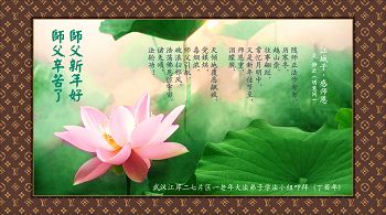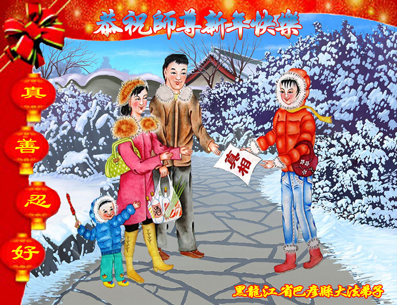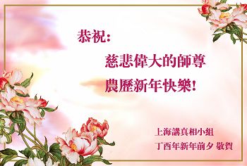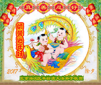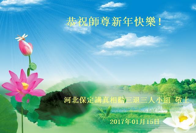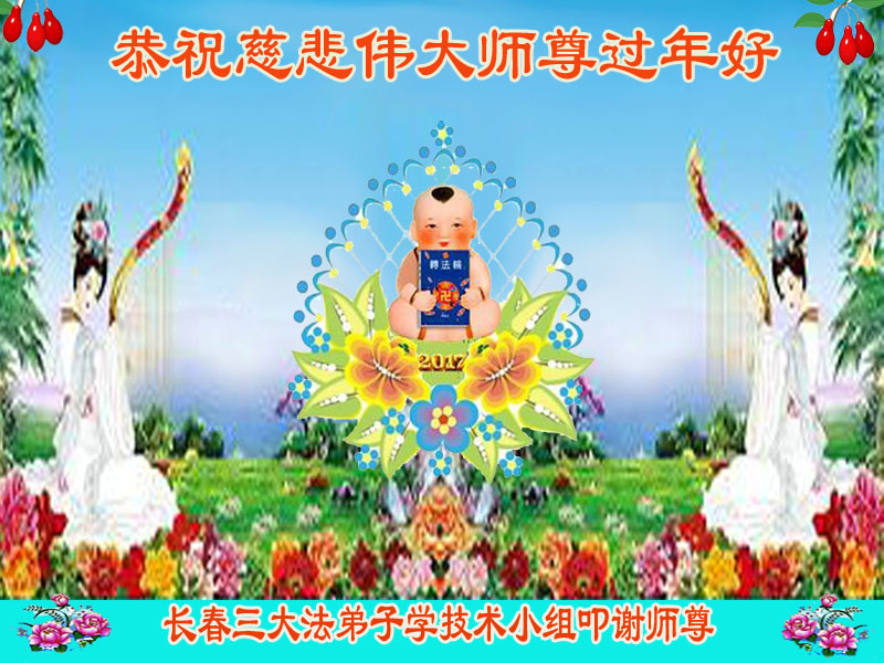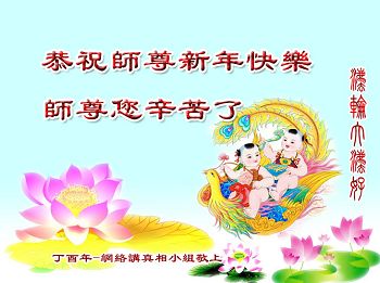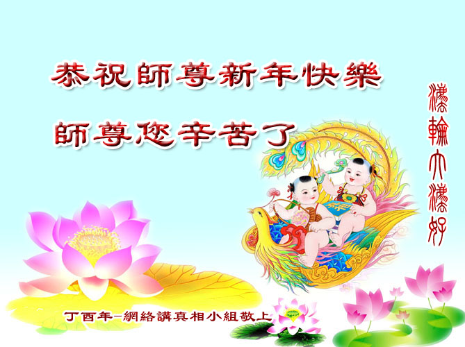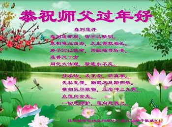 | 【明慧网二零一七年一月二十八日】 “披星戴月携手行 真相小组步没停 形成整体救众生 公检法司心渐明 新年佳节人欢庆 牵手众生法船登 谨遵师命多救人 兑现誓约回天庭” 修炼真、善、忍的大法弟子们,在中共江氏集团发动的十七年的迫害中,秉持大善大忍的胸怀,“遵师命多救人”,不辞劳苦地把法轮大法好的福音传给百姓,把大法的真相讲给有缘人。在中国传统新年来临之际,大法弟子们向慈悲伟大的师尊拜年! 黑龙江省绥化市安达市大法弟子说:“我们三个老年大法弟子,虽然都是七十多岁的人,长期坚持面对面讲真相,无论酷暑,还是寒冬,风雨无阻,一天不落。” 山东烟台地区贴展板小组的大法弟子在写给师尊的贺词中说:“我们小组把真相展板贴挂在城区和农村、法院门口、610大院、公安局门口。在新的一年里,抓紧时间实修自己,救更多的人。” 黑龙江省巴彦县大法弟子恭祝师尊新年快乐!北京真相小组大法弟子恭祝师尊新年好!我们真相小组分工明确,根据自己所长,有打印资料的,有专门上网的,有面对面讲真相的,有发真相的,有打真相电话的,有换真相币的、发挂历的…… 我们小组最大的特点就是,十九年没间断学法,每天必须学法、发正念、讲真相,相互配合,看到不足都是当面指出,向内找成了日常的习惯,踏踏实实的修炼。 北京大法弟子 跪拜敬上 “笃记使命,圆容师尊所要”佳木斯市电话真相组12名大法弟子恭祝师父的过年好!弟子们向师父拜年,弟子们想念师父,师父您辛苦了,师父过年好! 请师父放心,弟子们在正法的最后时刻一定做好三件事,修好自己,同化大法,多救人,完成神圣使命! 春到莲开 春到莲满庭,宙宇已晴明。 真相遍及四海,众生得救福长。 弟子笃记使命,圆容师尊所要, 莲香沁十方。 同化大法理,精進永不忘。 多学法,发正念,讲真相。 无私无我,勤勉不怠踏归航。 横扫灭尽败物,正念冲上九霄, 众莲闪金光。 一切恩师护,弟子向您敬上 佳木斯市电话真相组12名大法弟子敬献 坚持面对面讲真相 武汉市江岸区二七片区一老年学法小组全体大法弟子恭贺伟大慈悲的师父新年快乐!师父您好!师父辛苦了!我们是一群老年大法弟子,大部份都已经修炼二十多年。面对面讲真相是我们主要的救人项目。丁酉年伊始,恭祝师尊新年快乐! 在新的一年里,在时间所剩不多的正法修炼的最后,我们要做好三件事,修好自己,救更多的人,以报师恩! 上海讲真相小组恭贺师尊皇历新年快乐!勤学法、讲真相 辽宁沈阳大法弟子感谢师父慈悲加持代辽宁沈阳铁西区、于洪区的三个学法小组问候师尊新年好! 我们的学法小组老年同修多,她们都退休了,基本每天都是上午学法下午去讲真相,在个人修炼上努力做好,听师父的话,多救人。在新年到来之际,大家都祝福师尊新年好! 感恩您的恩德:是您的承受与付出,才有了三界万物的留存;是您的慈悲加持,大法弟子才能在邪恶制造的疯狂的魔难中修炼成熟;承蒙您的恩德,众生才有了得救的机会。 在新的一年到来时,我们学法小组叩谢师恩!师父啊!谢谢您!师父啊!辛苦了!我们会珍惜分分秒秒,做好三件事的,不辜负您的慈悲! 另外代表辽宁朝阳、辽宁建平在狱中被非法关押的大法弟子极其家属向您拜年! 辽宁沈阳大法弟子敬上 风雨无阻面对面讲真相救人 黑龙江省绥化市安达市大法弟子恭祝师尊新年好!我们三个老年大法弟子长期坚持面对面讲真相,风雨无阻,无论酷暑,还是寒冬,一天不落,虽然都是七十多的人。我们一起学法,互相鼓励,共同精進。有一位后得法的老年弟子,一个字不识,非常精進,天天念记大法书,现在都能通读大法书。 网络传真相小组大法弟子恭祝师尊新年快乐!师尊您辛苦了!辽宁盘锦手机项目组大法弟子恭祝慈悲伟大的师尊过年好!在正法的最后时刻,一定要学好法,做好三件事,利用好手机多救人。 辽宁盘锦手机项目组大法弟子跪拜 河北省唐山市丰润区下乡救人小组大法弟子恭祝慈悲伟大的师尊过年好!恭祝慈悲伟大的师尊过年好!弟子叩拜师尊! 所有的感恩,所有的期待都在新的一年化作我们精進实修的动力!弟子请师尊放心,我们一定学好法,跟您回家! 浊世淤泥绽净莲, 云游十方传真言。 慈悲含笑唤有缘, 讥笑辱骂心坦然。 狂飙恶浪志更坚, 蟾蜍休想遮住天。 待到油锅烹江鬼, 恭迎圣王大团圆! 唐山市丰润区下乡救人小组叩拜! 真相展板传真相 山东烟台地区展板小组三人大法弟子恭祝师尊过年好!感谢慈悲伟大师尊的救度之恩,弟子给师尊拜年!师尊过年好!在伟大的师尊慈悲看护下,我们小组把真相展板贴挂在城区和农村、法院门口、610大院、公安局门口。在新的一年里,抓紧时间实修自己,救更多的人。 讲真相劝三:退. 河北保定三人小组恭祝师尊新年快乐!在新的一年里,我们会更加精進,做好三件事,圆满随师还! 辽宁抚顺一发正念小组大法弟子恭祝慈悲伟大的师尊新年好!我们发正念小组值此辞旧迎新之时叩谢师恩!向慈悲伟大的师尊问好!师尊过年好!师尊辛苦了! 在助师正法的最后阶段,我们谨遵师尊的教诲,学好法,发好正念,多救人,修好自己,走正走好回家的路,向师尊交上一份满意的答卷。 佳木斯大法弟子恭祝伟大师尊新年快乐!新年贺新岁,救人最慈悲。 走在大街上,慈心劝三:退.。 有法有智慧,助师救人贵。 历史大审判,人人都定位。 佳木斯市一真相小组全体大法弟子恭祝师父新