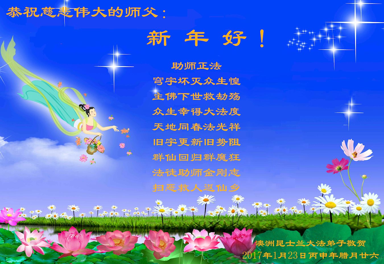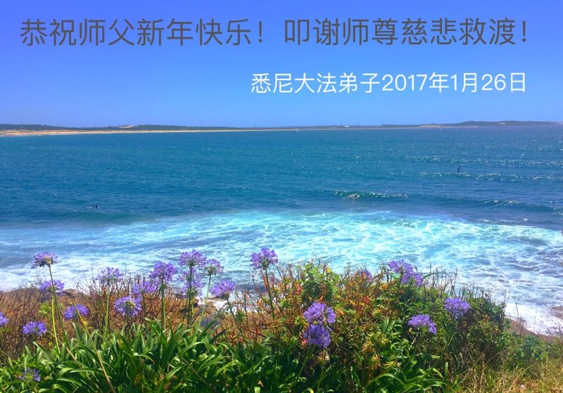 在此鸡年到来之际,澳洲昆士兰大法弟子恭祝师父过年好!师父,您辛苦了!在2017新的一年里,我们一定更加精進,修好自己,做好“三件事”,不负“正法时期大法弟子”的神圣称号!助师正法,救度更多众生,兑现史前誓约! 助师正法 穹宇坏灭众生惶 主佛下世救劫殇 众生幸得大法度 天地同春法光祥 旧宇更新旧势阻 群仙回归群魔狂 法徒助师金刚志 扫恶救人返仙乡 澳洲昆士兰大法弟子敬上 悉尼大法弟子恭祝师尊过年好!