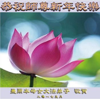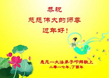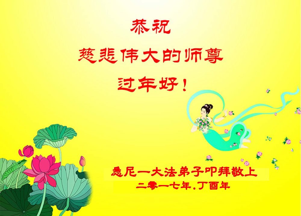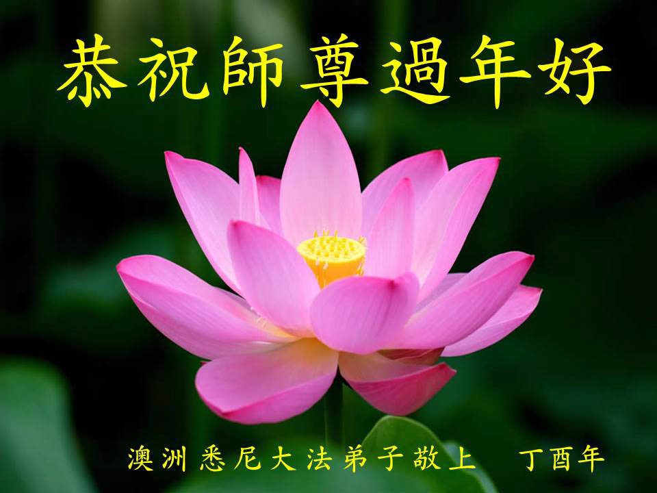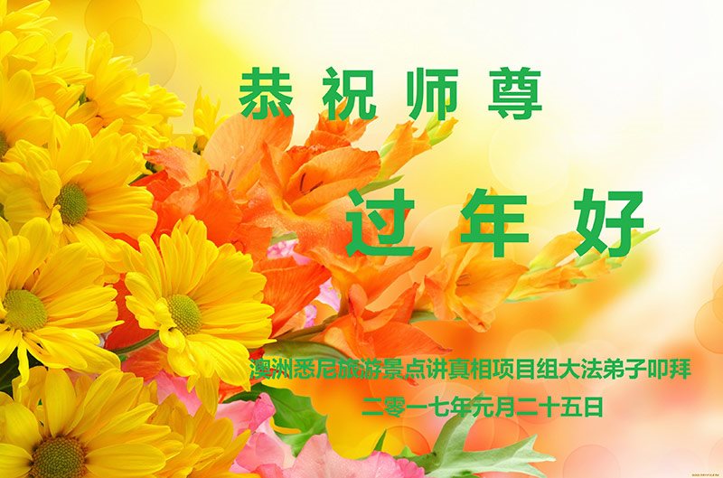 师尊您好! 在这丁酉年中国新年来临之际,弟子以最诚挚的心情向您最伟大的师尊致以节日的问候,同时恭祝您新年快乐!过年好! 师尊给予弟子的太多太多,弟子无以报答。弟子唯有牢记师尊的谆谆教诲、谨记自己的历史使命,在这修炼的路上,在这修炼的最后时刻,勇猛精進再精進,努力做好三件事,修去人心与观念,讲好真相多救人,以报师尊对弟子的慈悲苦度。 弟子在此跪拜伟大慈悲的师父!双手合十! 悉尼大法弟子恭祝师父新年快乐!