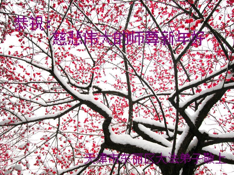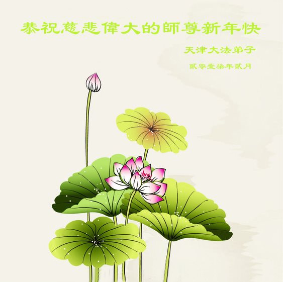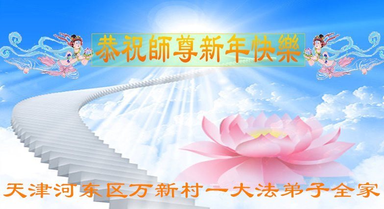 在新年来临之际,我代表我们全家向慈悲伟大的师尊拜年!祝师尊新年快乐! 弟子唯有精進以报师恩,做好三件事,不辜负师父的慈悲救度。 天津大陆大法弟子。 天津市东丽区大法弟子恭祝慈悲伟大的师尊新年好!