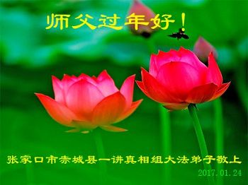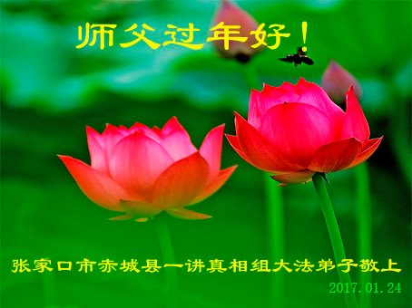 恭祝慈悲伟大的师尊新年快乐!师父您辛苦了!谢谢师父的慈悲救度! 在这最后的时间里,我们要更加珍惜师尊用巨大承受延续来的每一天,做好三件事。弟子们更要多学法,遇事多向内找,多救人,只走师父安排的路。让师尊多一份欣慰,少一份操劳。 河北省张家口市一学法小组全体弟子跪拜敬上 2017年1月24日 河北张家口市一家二位大法弟子恭祝师父过年好!