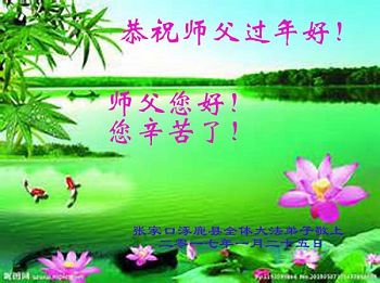 师尊您好!您辛苦了!在新的一年里,我们决不辜负您的慈悲苦度。向内找,修好自己,整体配合,多救人,完成史前大愿,圆满随师还! 河北省张家口市赤城县一讲真相组大法弟子恭祝师尊过年好!