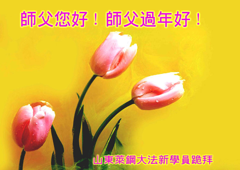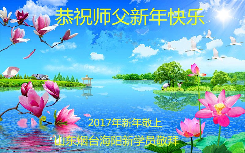 我是九八年修炼大法的老年弟子,学法以前是一身病的废人,眼睛、牙齿、全身到处都是病,好难受呀! 学法以后,师父从地狱里把我捞了出来,师尊用巨大的能量洗净我生生世世的业力,使我变成了一个正常人,舒服极了。 我们用尽语言都感谢不了师尊的慈悲苦度,只有好好修炼,做好师父要求的三件事,讲好真相、发好正念、多救众生,向师父合十拜年!祝师父新年好!早日随师把家归。 湖南省衡阳大法弟子 我是2016年的新学员,也是大法小弟子,没学法以前,常常遇到许多灾难,因为奶奶是学法轮大法的,奶奶教我修炼法轮功,师父为我净化身体、消除灾难、救我生命,感谢师父的慈悲苦度,我今后一定读好书、炼好功。祝师父新年快乐!普度更多众生! 山东省烟台市海阳新学员恭祝师父新年快乐!