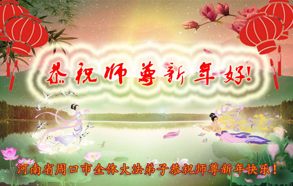 师尊好,师尊新年快乐! 我们小组成员表示在新的一年里,学好法,修好自己,配合好,多救人,让师尊少一份操劳,多一份安慰! 弟子叩拜师尊 河南省周口市全体大法弟子恭祝师尊过年好!