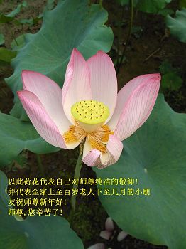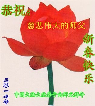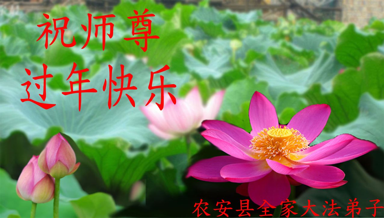 仅以此荷花代表我及家人对慈悲伟大的师尊最纯洁的敬仰!并祝师尊新年好!弟子定痛改前非,走好余下的路,也许弟子在修炼的路上东跌西倒,但对师尊的敬仰之心犹如莲花般纯净,永远不会改变! 农安县夫妻大法弟子祝师尊过年快乐!