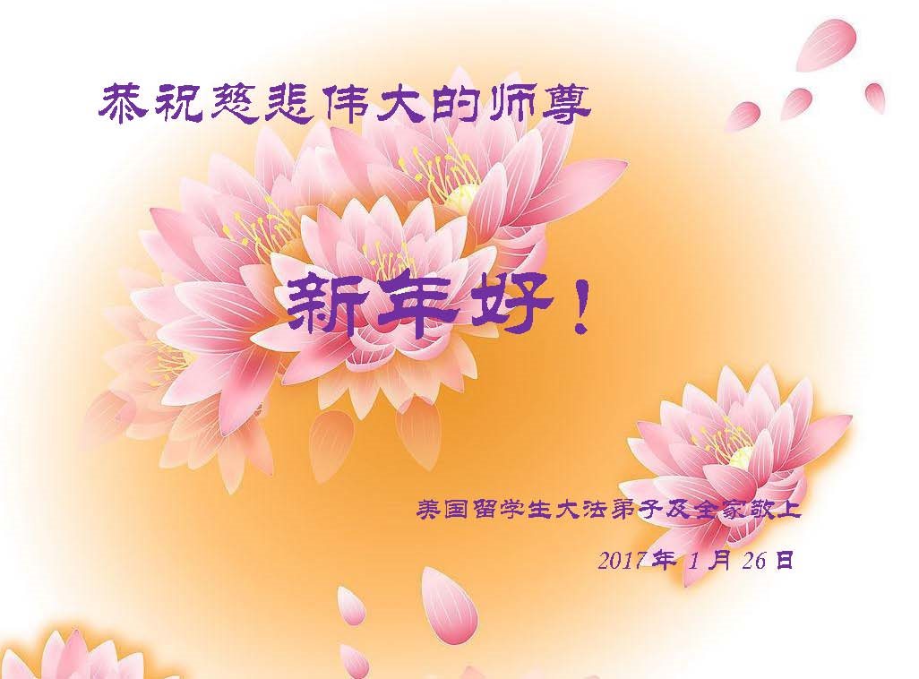 祝最伟大慈悲的师尊新年快乐! 我十几岁就跟父母修炼法轮大法,大法给我健康的身心,指引我走向光明,一路走来十几年,现在已是而立之年,我婆家和我全家全都修炼法轮大法,还有我哥和我的嫂嫂也修法轮大法。还有我的一岁半的宝宝也跟随全家修炼法轮大法。谢谢师父啊,我有这样一个好的环境,新的一年里,我一定要努力了,这些年修的都不精進,不能老是愧对师尊的慈悲看护。谢谢师父。祝愿师父,感恩师父!叩拜师尊! 美国留学生大法弟子及全家恭祝师尊新年好!