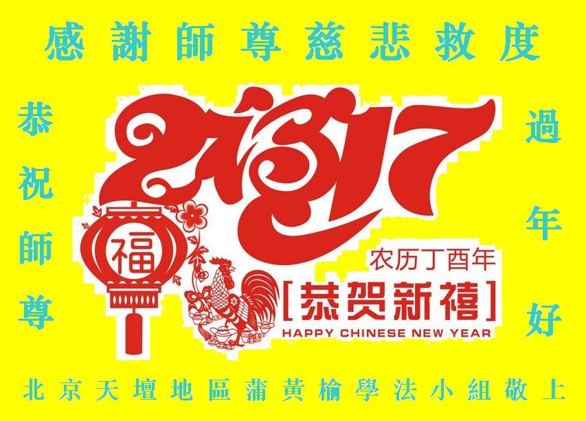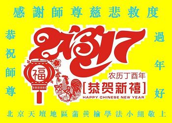 弟子想念师父。在新的一年里,我们学法小组一定遵循师父的教导多学法、学好法,修好自己,遇事向内找,多救人,做好三件事,恭迎法正人间的辉煌时刻。 两学法小组弟子跪拜师尊救度之恩! 辽宁大连两学法小组及家人 二零一七年一月二十四日 天津市法轮大法弟子恭祝伟大慈悲的师尊新年快乐!