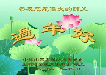 中国山东省东营市广饶县全体大法弟子恭祝慈悲伟大的师父过年好!谢谢师父!