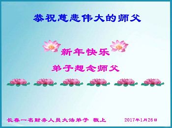 师父,在2017年里我要做好三件事,向内找,修好自己,救度众生,请师父放心。师父我们等您回来! 黑龙江省双鸭山大林一家人大法弟子恭祝师父新年好!