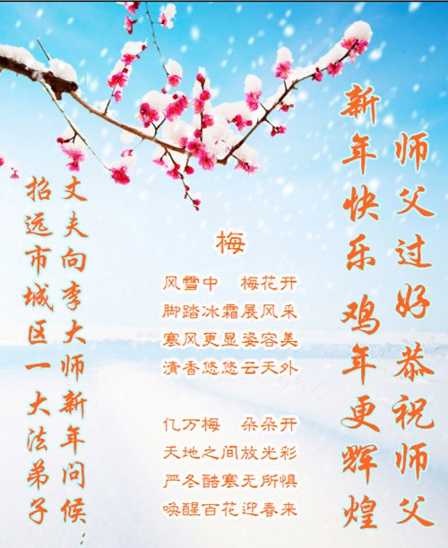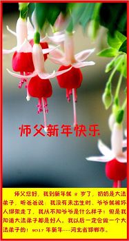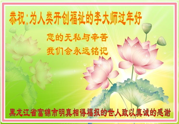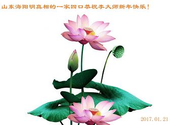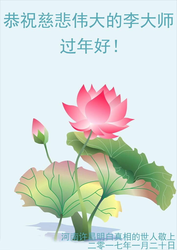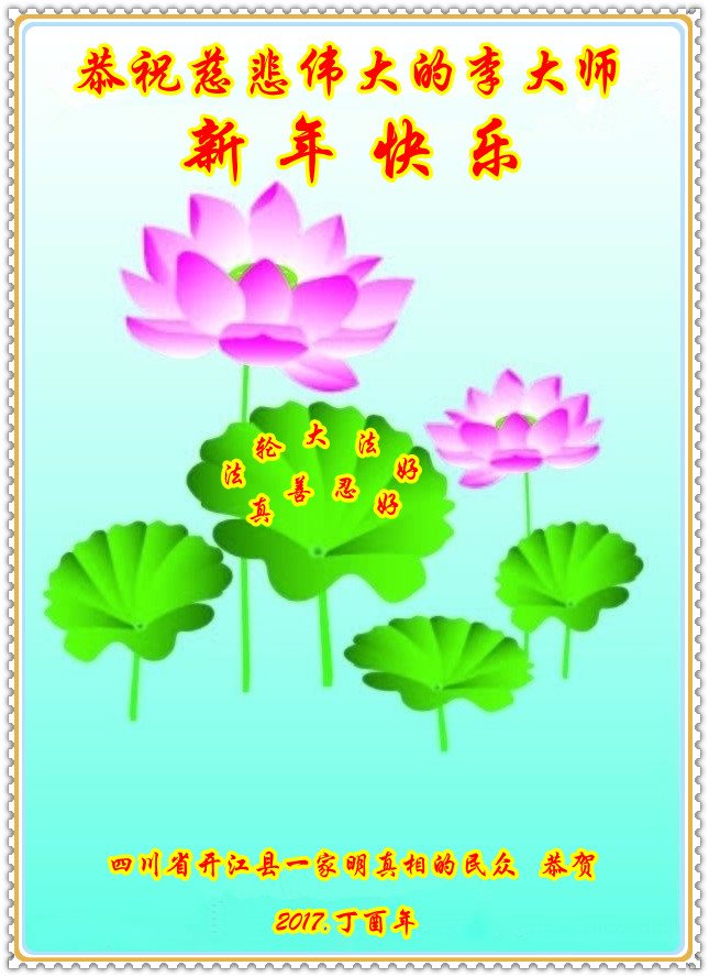 | 【明慧网二零一七年一月二十九日】新年来临,法轮大法弟子身边亲人写下一封封真挚的贺词,向法轮大法李洪志师父表达他们对大法的感恩和支持。 法轮大法自从1992年5月由李洪志师尊从长春传出,仅7年时间,修者日众,无数的家人看到亲人修炼法轮大法,从病榻上站起,过上了正常人的生活;无数的家人感受到亲人变的忍让宽容,不再有家庭矛盾的纠缠,夫妻和睦、婆媳和好、儿女得福、工作顺畅……即使在中共迫害下,同样承受苦难的家人也一如既往的支持大法、支持亲人修炼大法,他们见证了“法轮大法好”。 四川省开江县一女大法弟子的丈夫说:“我喜欢看法轮功的真相资料,心中牢记着‘法轮大法好,真善忍好’。感谢李老师带给我们全家人健康的身体,和睦的家庭关系,去除了病痛的折磨。” 河北保定市涿州市大法弟子的四位家人表示:“我妈修炼大法,全身疾病烟消云散,一身轻,还能为我们分担很多家务,而且我们的事业也发达,孩子都健康成长,我们打心眼里感谢大法师父。” 黑龙江佳木斯在大法中受益的全家:“在这些年里,我目睹了大法弟子对大法的尊崇与救人的付出。在新的一年里,我们向远在大洋彼岸李大师致以节日的问候!愿您身体健康,一切顺意!大法弘扬更广,使这个世界变的更美好,没有虚伪、残酷和冷漠。让真、善、忍光辉照亮全世界。” “岳父岳母修大法,精神好,身体好,我们喜在心里”黑龙江省绥化市安达市大法弟子和家属恭祝师父新年好! 岳父说:新年将到,我以感恩的心情,感谢伟大的师尊给予我的救度!我身上几种病,学了大法之后,都不治而愈。再次感谢师尊给予我第二次生命! 我是新学员,在学法方面也不精進,对法的内涵认识粗浅,离法对我的要求相差太远,但在法中受益很多! 新年到来之际,我衷心恭贺伟大的师尊新年好!祝师尊新年快乐!跪拜给师尊拜年!今后一定要认真学法,一定按法的要求做,一定做到信师信法,敬师敬法,要按法的要求对法加深理解认真学好法认真精進! 女儿说:新年即将来临,祝老师及家人新年快乐!我父母都是大法弟子,我们做子女的也非常支持,因为他们在学大法的过程中都受益了。 女婿说:在二零一七年新年即将来临之际,恭祝师父新春快乐!我的岳父岳母在几年的大法学习中,受益匪浅,而且他们的老病都好了。现在更是精神好,身体好,我们看在眼里,喜在心里。 外孙说:师父新年好!我姥姥、姥爷都是学大法的,并且他们现在身体很棒。 这两位夫妻同修的一家十口人都表达对师尊的感恩和新年祝福! 黑龙江省绥化市安达市大法弟子和家属 辽宁省大连地区一警察与妻儿恭祝李洪志师父新年愉快!大连地区一警察与妻儿丙申年除夕敬上 安徽省临泉县明真相的公检法干部及亲属恭祝李老师过年好!湖南九十岁刘朴梅:“法轮大法好,真善忍好,李大师好!”湖南九十岁老人刘朴梅敬祝李大师新年快乐! 我向李大师拜年! 我叫刘朴梅,今年九十岁了。敬祝李老师新年快乐! 我七十岁那年和老伴都看过法轮功的书,知道“法轮大法好,真善忍好,李大师好!”后来邪恶不准我们集体炼,但我坚持每天念法轮大法好,真善忍好,李大师好!有时间就念,我念了二十年。 看《转法轮》,受到李老师您的恩惠与保护。我身体挺硬的。谢谢李大师!给老师拜年! “法轮大法好!真、善、忍好!” 湖南刘朴梅老人敬拜 大陆明真相世人:“我们非常喜欢读《转法轮》书籍,幼小的孩子也喜欢听”大陆明真相世人恭祝师尊新年快乐! 虽然我们还没有正式走入修炼,但我们非常喜欢读《转法轮》书籍,幼小的孩子也喜欢听。二零一七年即将来临,在此我们也祝愿师尊新年快乐!盼望师尊早日重返大陆,盼望神韵在大陆演出。 山东省烟台海阳市一乡村明真相世人:“明真相,日子一年比一年好”山东省烟台海阳市一乡村明真相世人一家四口恭祝慈悲伟大的李大师过年好! 李大师您过年好! 自从明白真相后,我们日子过得一年比一年好,感谢您的帮助,愿您过年好! 海阳市一乡村明真相世人一家四口恭祝李大师过年好! 辽宁鞍山初中生:“给李大师拜年了!愿您的弟子越来越多!”大陆辽宁鞍山一明真相初中生敬上! 给李大师拜年了!愿您的弟子越来越多! 黑龙江省富锦市明真相得福报的世人恭祝为人类开创福祉的李大师过年好!您的无私与辛苦,我们会永远铭记! 大法弟子的弟弟一家三口人恭祝师父新年快乐!山东省招远市大法弟子的丈夫恭祝慈悲伟大的师尊过年好!辽宁省鞍山大法弟子家属恭祝李洪志大师过年好!黑龙江七台河一大法弟子亲属恭贺李大师新年快乐!山东潍坊昌乐大法弟子家属给李老师拜年了!恭祝李老师新年快乐! 四川省开江县一家明真相的民众恭祝慈悲伟大的李大师新年快乐!鞍山明真相世人问李洪志大师新年好!恭祝李洪志大师新年新年快乐!期望中共暴政早日垮台的西安民众恭祝李大师新年快乐!四川省开江县明真相已三:退.的老年夫妻恭祝慈悲伟大的李大师新年快乐!山西忻州一明真相世人恭祝李大师新年快乐!甘肃会宁县明真相的小学生恭祝师尊新年好!河南许昌明白真相的世人恭祝李大师新年快乐!恭祝慈悲伟大的李大师新年快乐!我们感恩您的慈悲救度,在新的一年里严格要求自己按照真、善、忍去做一个好人。 河北保定市涿州市大法弟子四位家属恭祝师父新年快乐!在2017年新年之际,我代表全家向慈悲伟大的大法师父问好