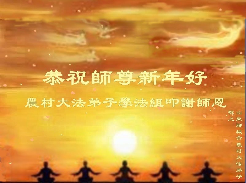 恭祝师尊新年好!叩谢师尊慈悲救度之恩! 我们学法小组有的学员得法前,疾病缠身,常年欠诊所的医药费,甚至过年时也还不清,经济压力很大,连买大法书的钱都拿不出,如今他们无病一身轻,其乐融融,全家人都感念师尊洪恩!我们自知与正法要求相差甚远,我们一定勇猛精進,多救人,跟上正法進程! 山东聊城市农村学法小组全体组员敬上 山西省大同乡村学法小组全体大法弟子恭祝师尊新年好!