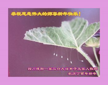 在新年即将来临之际,弟子遥祝师尊新年好!师尊您辛苦了!弟子想念您!在过去的一年里,弟子由于有许多放不下的人心执着,给师尊增添了很多麻烦,让师尊为弟子操了很多心血,弟子感到很内疚,为了成就弟子,师尊操尽了心。新的纪元开始了,弟子心中充满了希望和光明,下决心修好自己,多去人心执着,不给自己留下遗憾,勇猛精進,尽心尽力做好三件事,跟师尊回家,感谢师恩,下面以一首小诗敬献师尊: (一) 金鸡报晓天将明 春风拂拂气渐清 阴霾扫尽乾坤正 人间处处是新春 (二) 正法开创新纪元 师尊慈悲降甘霖 弟子随师讲真相 不畏甘苦心欢畅 (三) 雄鸡一唱天下白 大法真相遍全球 黑手烂鬼无处遁 洗尽铅华心如水 (四) 佛光普照礼仪明 大法众徒谢师恩 了却人心兑誓约 返本归真众神迎 四川省自贡市荣县长山镇一大法弟子及家人恭祝师尊新年快乐!