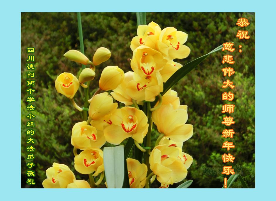 尊敬的师父你好! 全组大法弟子恭祝师父新年快乐!感谢师父的一路看护和慈悲苦度,弟子们唯有精進实修,做好三件事,跟师父回家。 四川德阳一老年学法组 四川德阳大法弟子恭祝师父新年快乐!