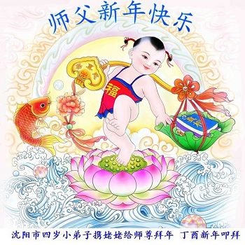祝愿师尊节日快乐!听师父的话,跟师父回家,勤学法多炼功,讲清真相救众生。 辽宁省沈阳一大法弟子及四岁小弟子给师尊拜年!