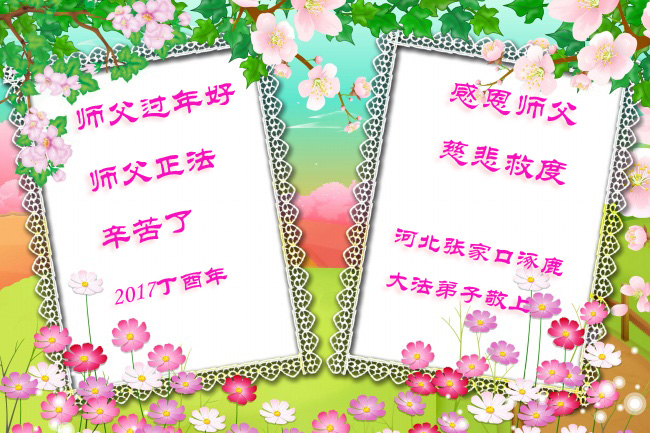转眼進入了2017年,是师父一路保护才使我们走到了今天。在新的一年里,弟子们更要倍加珍惜师父以巨大的承受与付出延续的时间,做好三件事,注重内境的升华,助师正法,完成使命!弟子们感恩师父的慈悲苦度,师父太辛苦了,弟子们叩拜师父!再叩拜! 感恩 法洒苍宇破雾明 真相大白万物醒 明白真相避大难 感恩师尊救度恩 法正乾坤师徒同心 历尽艰难狼烟灭尽 宇宙升辉仙乐齐鸣 缘归正道莲开满庭 天地苍生感恩师尊 感恩!感恩!感恩! 河北省张家口市蔚县大法弟子恭祝师尊过年好!