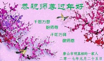 敬祝师父新年好! 时光匆匆,转眼又是新的一年,这一年不知师父又为众生承受了多少,才能使无数众生醒悟,使无数众生得救,使无数众生提升道德,使掉队的弟子跟上正法進程,使精進的弟子更加精進。陕西宝鸡大法弟子恭祝远在重洋的师尊新年快乐!弟子一定做好三件事,不负师父重托,讲清真相,救度众生。 明真相的大法弟子家属也恭祝师父新年好!新年快乐!盼望大法早日平反,盼望师父早日回归中国大陆,期盼法正人间的到来,一洗人间污浊,莲花开遍神州,万物回春,同沐法光。 弟子跪拜师尊 合十 宝鸡市一学法小组大法弟子 山东菏泽市牡丹区大法弟子祖孙三代及明白真相的家人向师父问好!