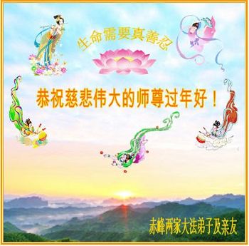 二零一七年新年来临之际,石岛全体大法弟子给伟大慈悲的师尊拜年来了!几十年的宇宙正法,师尊您辛苦了!石岛全体大法弟子由衷地感恩师尊的慈悲苦度! 大法弟子在红尘滚滚中,迷失了自己下世时与师尊的承诺:在人类面临危难时助师正法、救度众生的历史使命!弟子无法用语言形容此时此刻感恩师尊的慈悲挽救:从地狱捞起洗净,教诲大法弟子如何修心向善道德回升、法轮大法启迪大法弟子心灵善念、领悟助师正法救度众生的重要历史责任及使命!走到今天,石岛全体大法弟子非常明确:唯有慈悲伟大的创世主才能真正的救度众生返回原本属于自己的美好家园——天国世界去!人类这里算什么?只是神佛给人安排吃苦还债的场所!人心觉醒,行善积德,返本归真!才有机会返回天堂!人世间就是个旅店,没有什么可留恋的,过眼烟云! 珍惜法轮大法师尊洪传大法,挽救人类救度众生的万古难遇的珍贵机缘!石岛全体大法弟子再次感恩师尊的慈悲救度! 石岛全体大法弟子与家属多么希望即刻看到神韵来中国大陆巡演!弘扬中华五千年优秀传统文化!传递重要信息给中国人民,挽救中国人民被红魔搅乱迷失的心灵,唤醒良知善念!免于被历史所淘汰!中国大陆大法弟子恭请师尊成全、神韵尽早来中国大陆巡演救度众生于危难中!大法弟子感恩师尊拯救人类! 石岛全体大法弟子敬上合十 威海市部份大法弟子与明白真相的家属共同恭祝慈悲伟大的师尊新年快乐! 内蒙古自治区赤峰两个法轮大法弟子家族全体成员及明真相的亲友恭祝慈悲伟大的师尊过年好!
