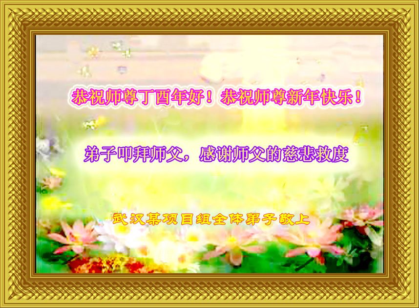 师父新年好! 弟子遥拜恩师! 感恩师父的慈悲救度,我们一定要在最后的时间里,抓紧修好自己。遇到问题向内找,形成整体多救人,不负师恩,完成好自己的历史使命,让师父多一份欣慰,少一份操劳。 湖北武汉二七片一学法小组大法弟子敬上 湖北省武汉市黄陂区大法弟子恭祝慈悲伟大的师尊新年快乐!