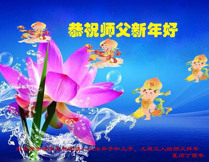 恭祝师尊新年好!弟子代全家人给师尊拜年! 师父辛苦了,感谢师父慈悲救度。弟子用尽人间所有的语言也无法表达对师父的感恩,12年的修炼,师父为弟子化解了无数魔难,只有弟子明白,弟子时刻都能感受到师父就在我身边,佛恩浩荡。师恩洪大,唯有精進实修,做好三件事,抓紧时间多救人,兑现誓约报师恩。 辽宁省大连大法弟子叩拜师父!师父过年好!