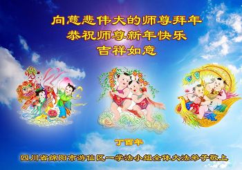 师父过年好!弟子及女儿两外孙恭祝师父过年好! 弟子代表四川省绵阳市游仙区一学法组向慈悲伟大的师父恭祝过年好! 归故乡 渐明真相有希望, 苦海无边心忧伤。 末世迷茫法光照, 众生醒来归故乡。 大法弟子会在新的一年里做好“三件事”不负师父慈悲苦度;让众生醒来归故乡。 德阳大法弟子绵阳大法弟子敬上!叩首! 吉林省辽源市一资料点大法弟子敬拜师尊过年好!