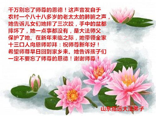 感恩师父的救度!学法以来收获颇多,也在尽自己绵薄之力去救助世人。反思过去所作所为,还需要精進提高,今后一定会牢记三件事,谨遵师尊教诲。 山东省青岛大法弟子恭祝伟大的师尊过年好!