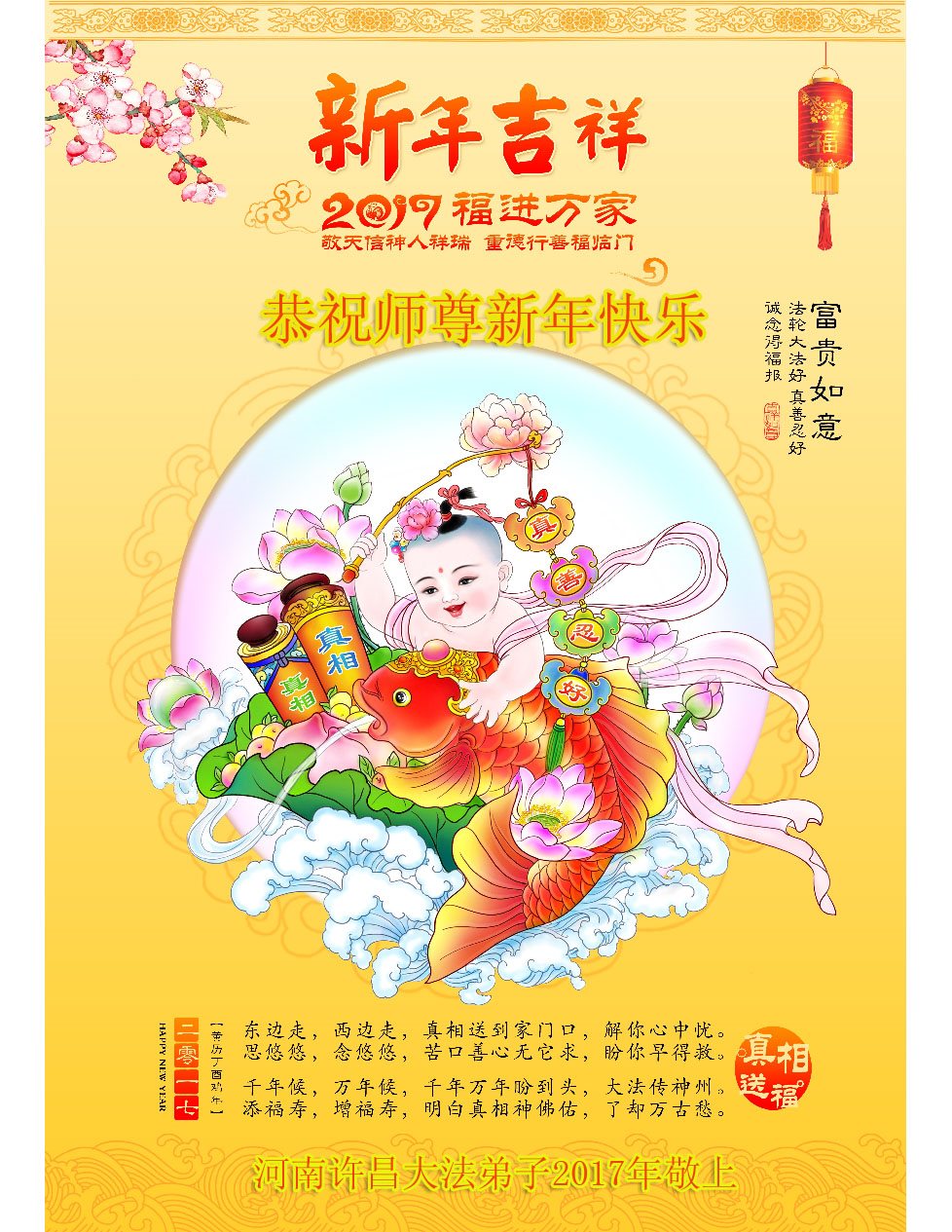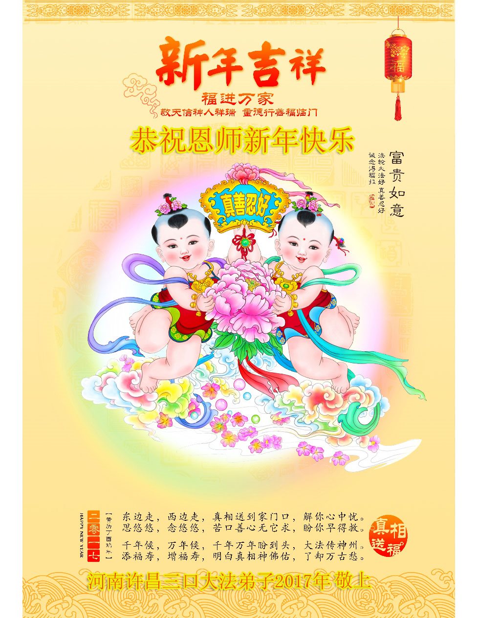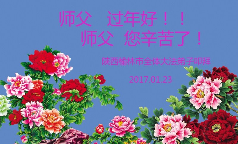 2017年新年来临之际,河南许昌三口大法弟子恭祝恩师新年快乐!弟子信师信法,要越来越精進,多学法,按大法的标准提高心性,坚定法轮大法。 陕西榆林全体大法弟子恭祝慈悲伟大的师尊新年快乐!