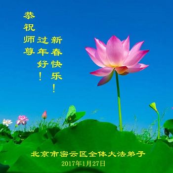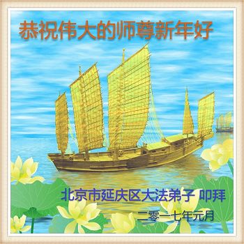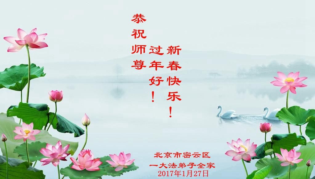 2017年新年到来之际,北京昌平大法老弟子向慈悲的师父拜年!祝师父新年快乐! 一路走来,深感师父洪恩浩荡,感谢师父救度!努力做好三件事,跟随师父回家! 弟子叩拜师父! 北京丰台大法弟子恭祝师尊新年快乐!