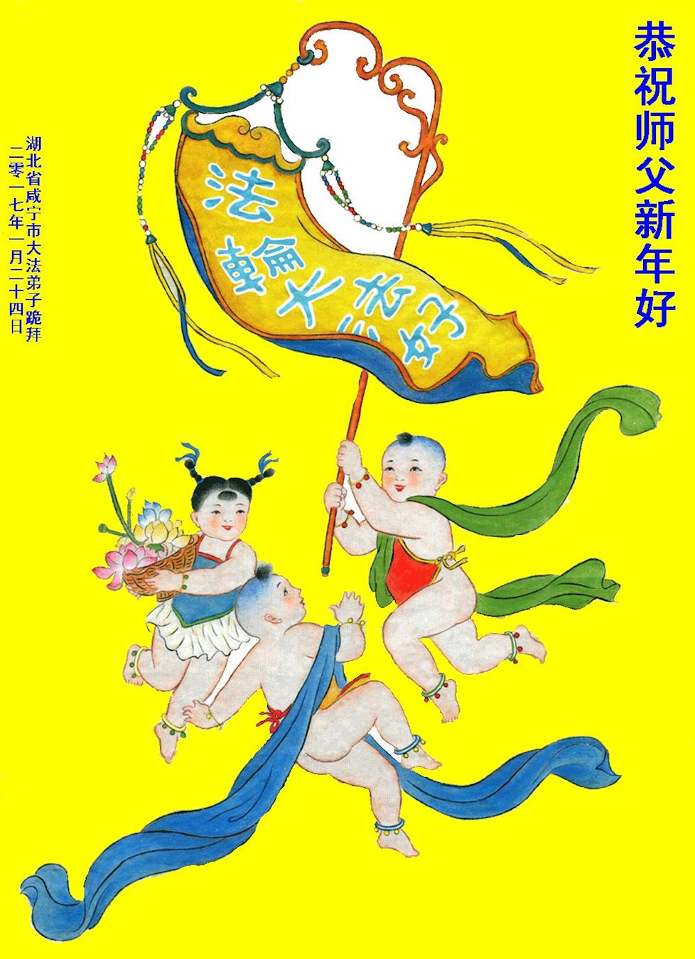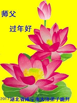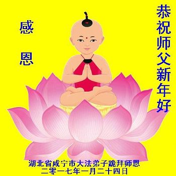 尊敬的师尊新年好!二零一六年已经过去,二零一七年已经到来,回想在过去的一年里,师父多少次把我从死神手里救回!过去的是岁月、留下的是记忆,弟子会永远铭记师尊的救度之恩!听师父的话,做好三件事,修好自己,以报师恩! 武汉大法弟子敬贺 2017.1.26。 湖北省咸宁市大法弟子恭祝师父新年好!