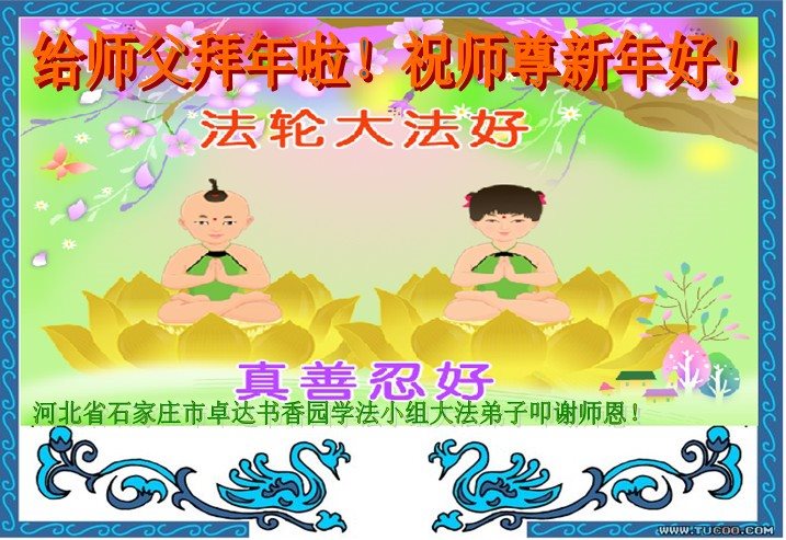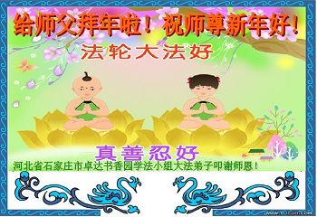 师父过年好,师父您辛苦了!弟子们想念师父。 弟子在新的一年里要多学法,实修多救人,跟师父回家! 石家庄北站片四位老年大法弟子学法小组弟子跪拜 河北石家庄裕华区一学法小组与家人恭祝师尊新年好!