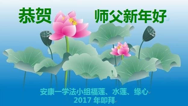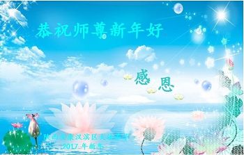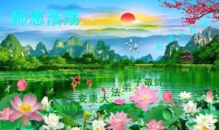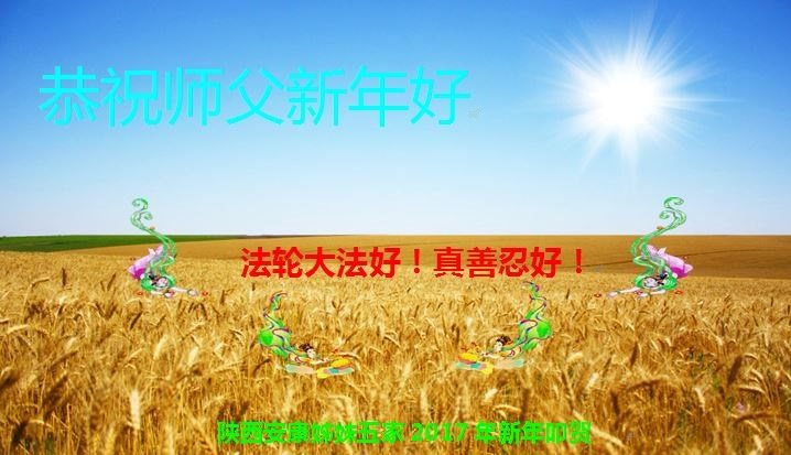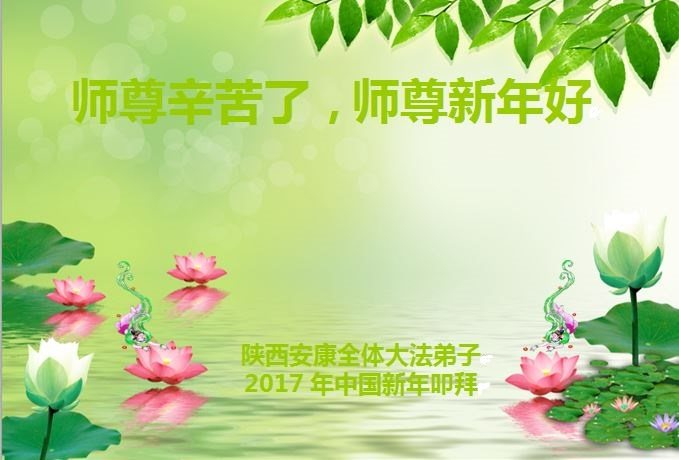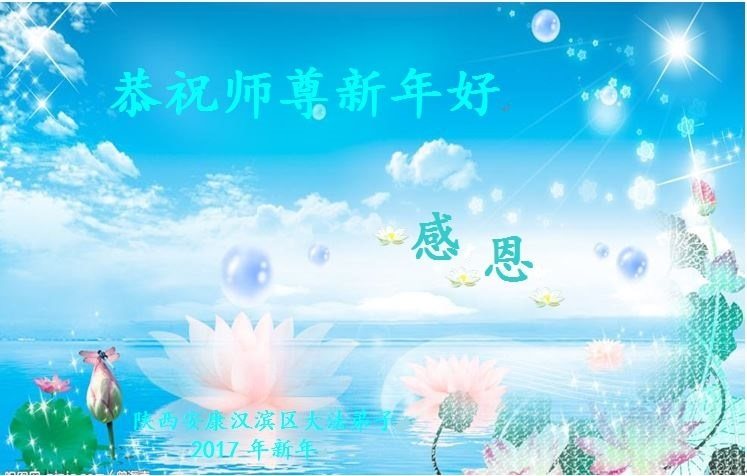 恭祝慈悲伟大的师尊: 过年好!师父您辛苦了!大陆大法弟子想念您啊! “每逢佳节倍思亲”,十七年了,师父离开故国,越过大海,去到那遥远的美国,传法度人,历尽艰辛,大陆大法弟子在邪恶的打压下,坚定修炼,讲真相,救度众生,虽然天各一方,但我们的心时时和师父在一起,从来也没有分开过。 在这正法的在最后时刻,弟子们更加珍惜师尊用最大的承受和付出为弟子们延续来的时间,做好大法弟子应该做好的“三件事”,学好法、修好自己,整体提高,共同升华,圆满随师还。 弟子以虔诚的心,愿师尊从返故国的时刻来临。 陕西省宝鸡市全体大法弟子恭祝师尊新年好!双手合十! 二零一七年元月二十六日 陕西榆林全体大法弟子新老学员恭祝师尊过年好!