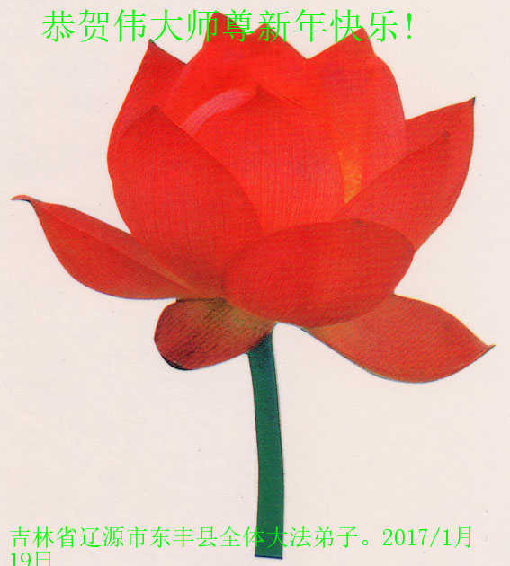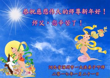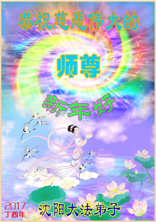 崭新的一年已来到我们面前,时值新春佳节,千言万语道不完我们对师尊的感恩和思念,唯有更好的学法、向内找、时时修好自己,做好三件事,让师父欣慰。 齐齐哈尔讷河市全体大法弟子于2017新春敬上 辽宁省沈阳大法弟子恭祝师尊新年快乐!