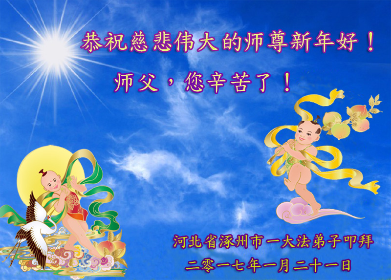 弟子恭祝慈悲伟大的师尊新年好!弟子一定努力学好法,做好三件事,听师父的话,精進实修,多救众生,跟师父回家! 河北涿州一学法小组大法弟子敬上 2017年1月25日 河北省保定市涿州市一大法弟子恭祝慈悲伟大的师尊新年好!