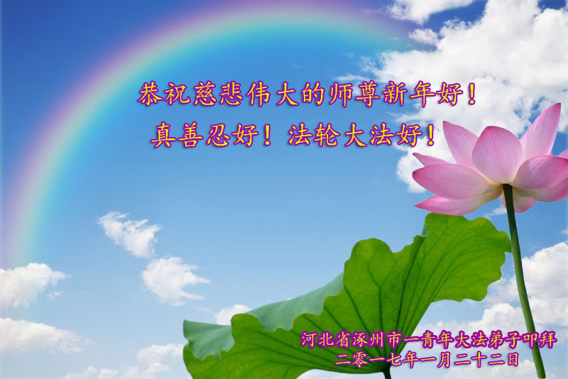 二十一年,从少不更事的随父母一起走入大法中修炼,到今天理性的认识法,弟子每走一步都离不开师尊的慈悲呵护,用尽人间任何语言也无法表达弟子对师尊的感恩,弟子唯有精進实修,在所剩不多的时间里,修好自己,做好三件事,去掉安逸懒惰心,显示心,怨恨心,妒嫉心等等一切不好的人心,去掉一切不符合法的人心、观念、执着,抓紧时间多救人,做好三件事圆满随师还! 河北省涿州市一青年大法弟子叩拜师尊 2017年1月25日 黑龙江省齐齐哈尔讷河市全体大法弟子恭祝慈悲伟大的师尊新年快乐!