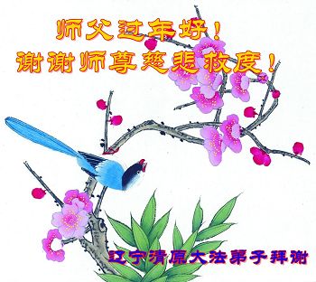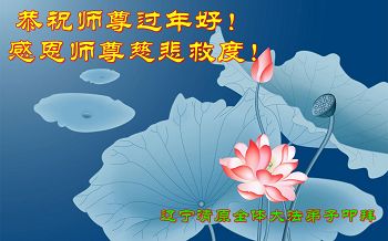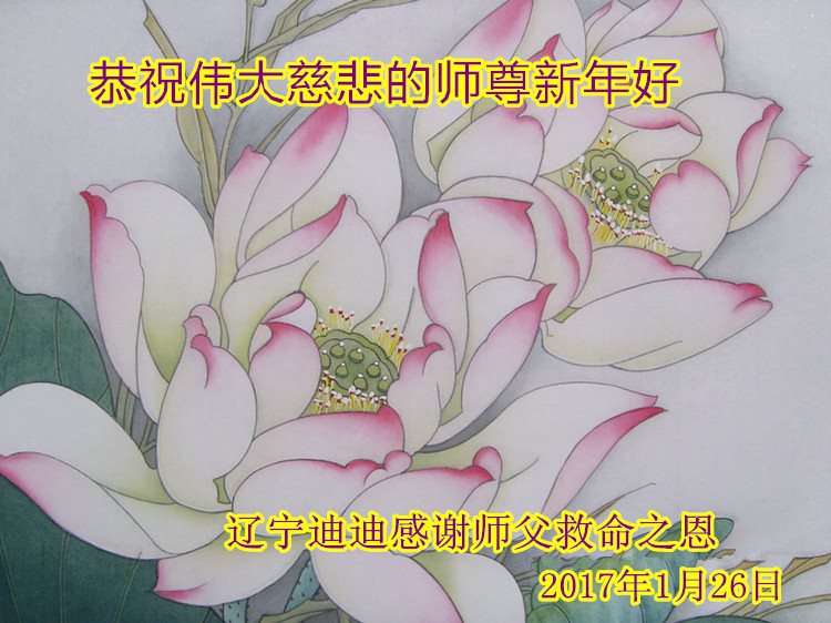 尊敬的师父您好!弟子们给您拜年了!新年不忘师恩啊! 末劫师尊下世间 慈悲救度大法传 三字真经弟子记 人心善 返本源 浊世荷花育成莲 叩谢师尊 法徒救人苦陪伴 解救众生甘露散 管它寒暑艰与难 众生醒 恶党完 寰宇恩庆霞满天 谢师尊 谢师尊 辽宁大法弟子恭祝师尊新年快乐!