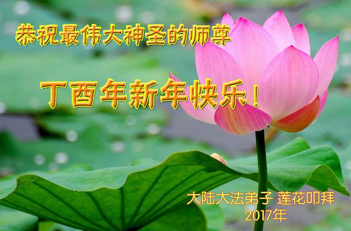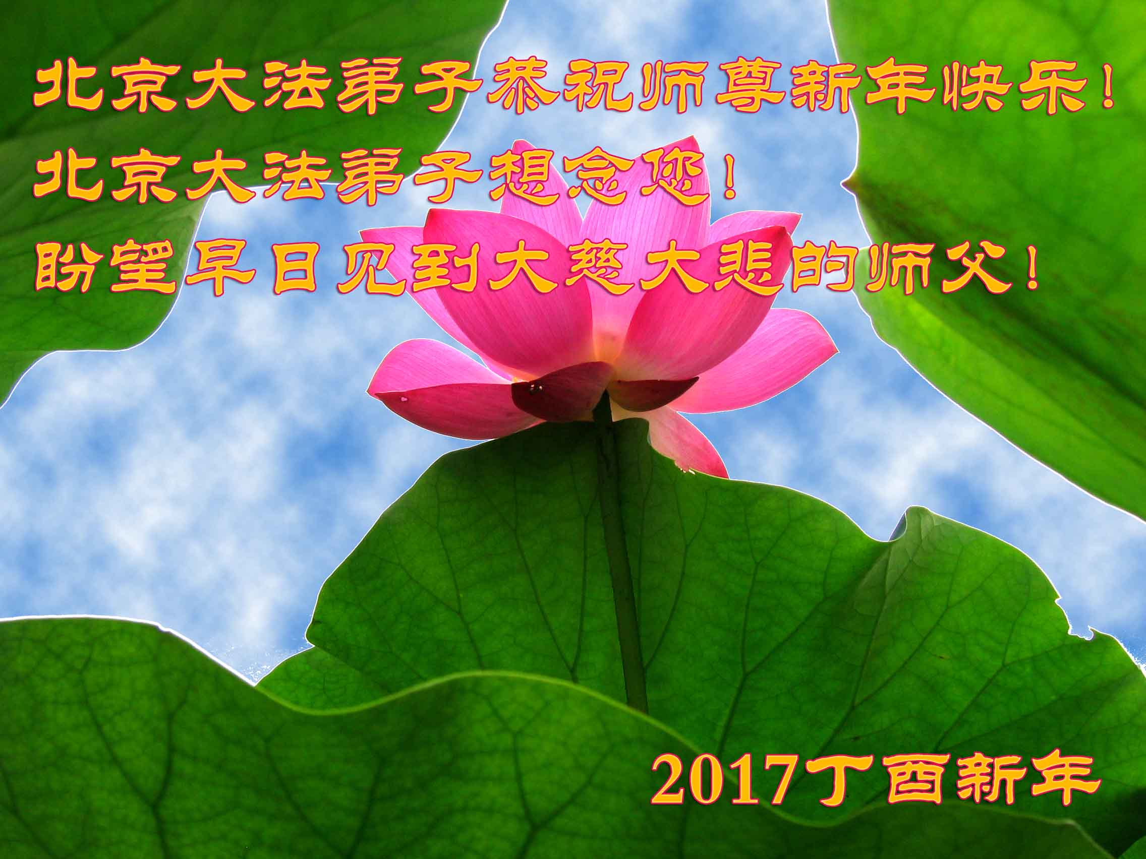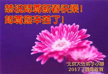 我们都是决心同化大法,坚定的跟随师父回家的北京大法弟子。我们在修炼中越来越体会到师父的大慈大悲,大法的洪大。每个人都体验到自己在法中身心的巨大变化。北京大法弟子感谢师父给予我们真正的生命!北京大法弟子感恩师父的救度之恩! 我们知道由于我们做的还不够标准,让师父为我们付出的太大太大,操心的太多太多,我们感到内疚。我们一定要精進实修,好好修炼多救人,证实大法。我们一切只听师父的话,一切只听从师父的安排,走好我们最后的修炼路跟师父回家。 北京部份大法弟子恭祝师尊新年快乐! 辽宁省铁岭市开原市大法弟子给师父拜年