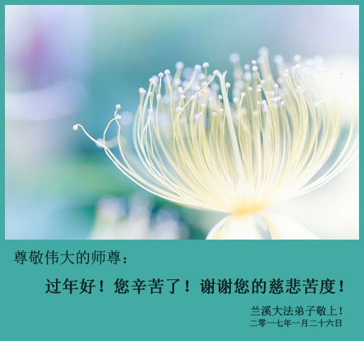 慈悲而伟大的师尊:新年好!您辛苦了! 日日年年换新年, 众弟子助师正法, 常人心做常人事, 迷于半路难得救, 去人心修得正念, 除魔斩妖归正路, 回归路上须清醒, 大法弟子担重任, 越到最后勿放松, 唯有精進不停, 正念正行才可随师还! 兰溪大法弟子敬上! 二零一七年一月二十六日 浙江永康大法弟子恭祝伟大的师尊新年快乐!