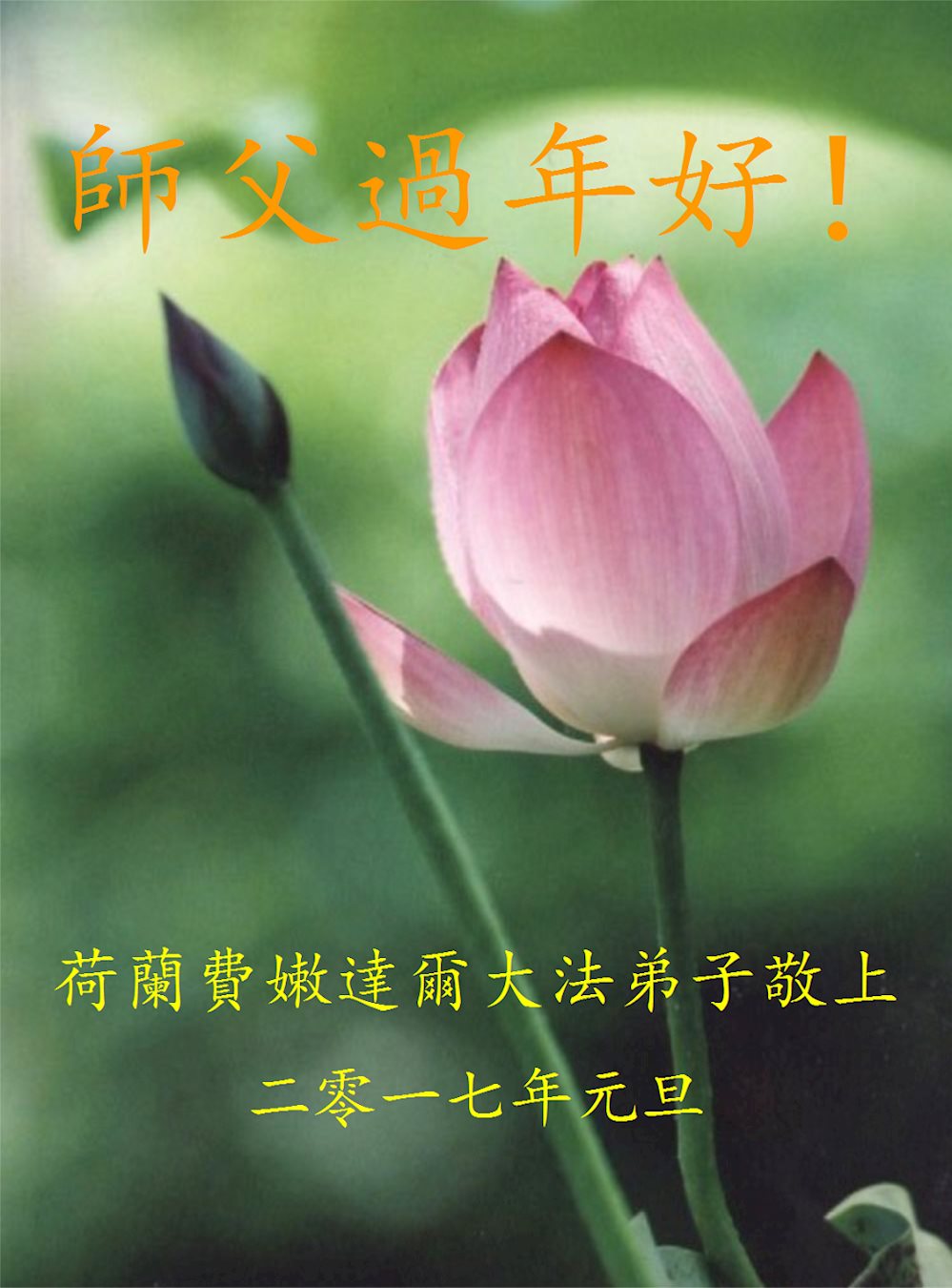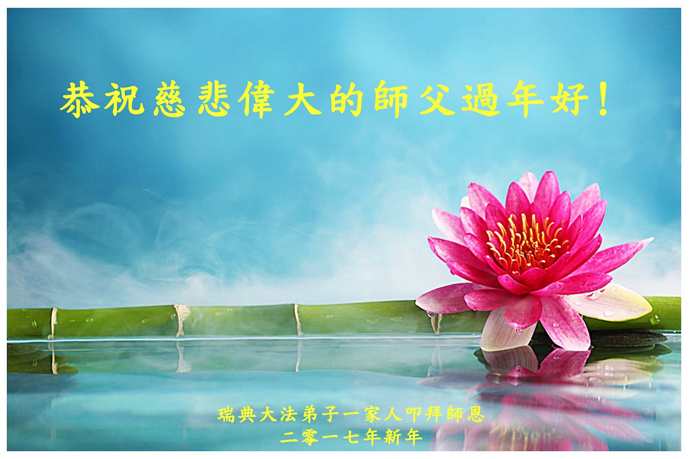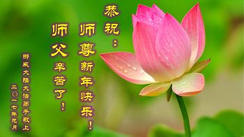 三百六十五天,沐浴在师父慈悲洪大的佛恩中,我们一家人在摔摔打打中走过了2016年,是师父用巨大的承受换来弟子们不断的提高、不断的悟道。无以回报师恩,弟子们唯有精進再精進,在实修中不断的走向成熟,做好三件事,救度更多的众生,让师父少一份操劳,多一份欣慰! 再一次恭祝慈悲伟大的师父过年好!师父您辛苦了! 弟子全家叩拜师恩! 瑞典斯德哥尔摩一家四口大法弟子恭祝慈悲伟大的师尊新年快乐!