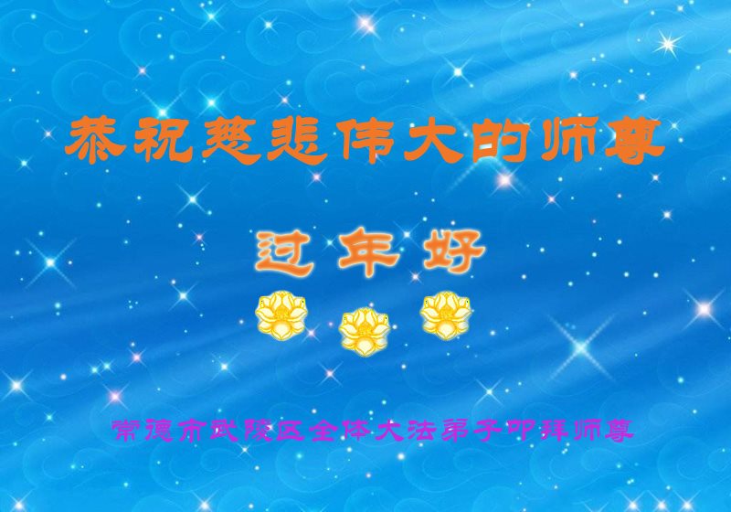 师尊为我们承受了巨大的苦难,保护我们的安全,给了我们最好的一切!我们全家人感谢师尊的慈悲苦度!我们在新的一年里会更加精進,放下人心,多救人。兑现誓约,以慰师恩! 河北庆云全体大法弟子祝师父新年快乐!