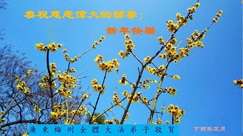 在新的一年里,做好三件事,精進,精進,更精進,圆满随师还。盼师父早日回大陆。叩拜师父,师父辛苦了! 广东省梅州市全体大法弟子恭祝师尊新年快乐!